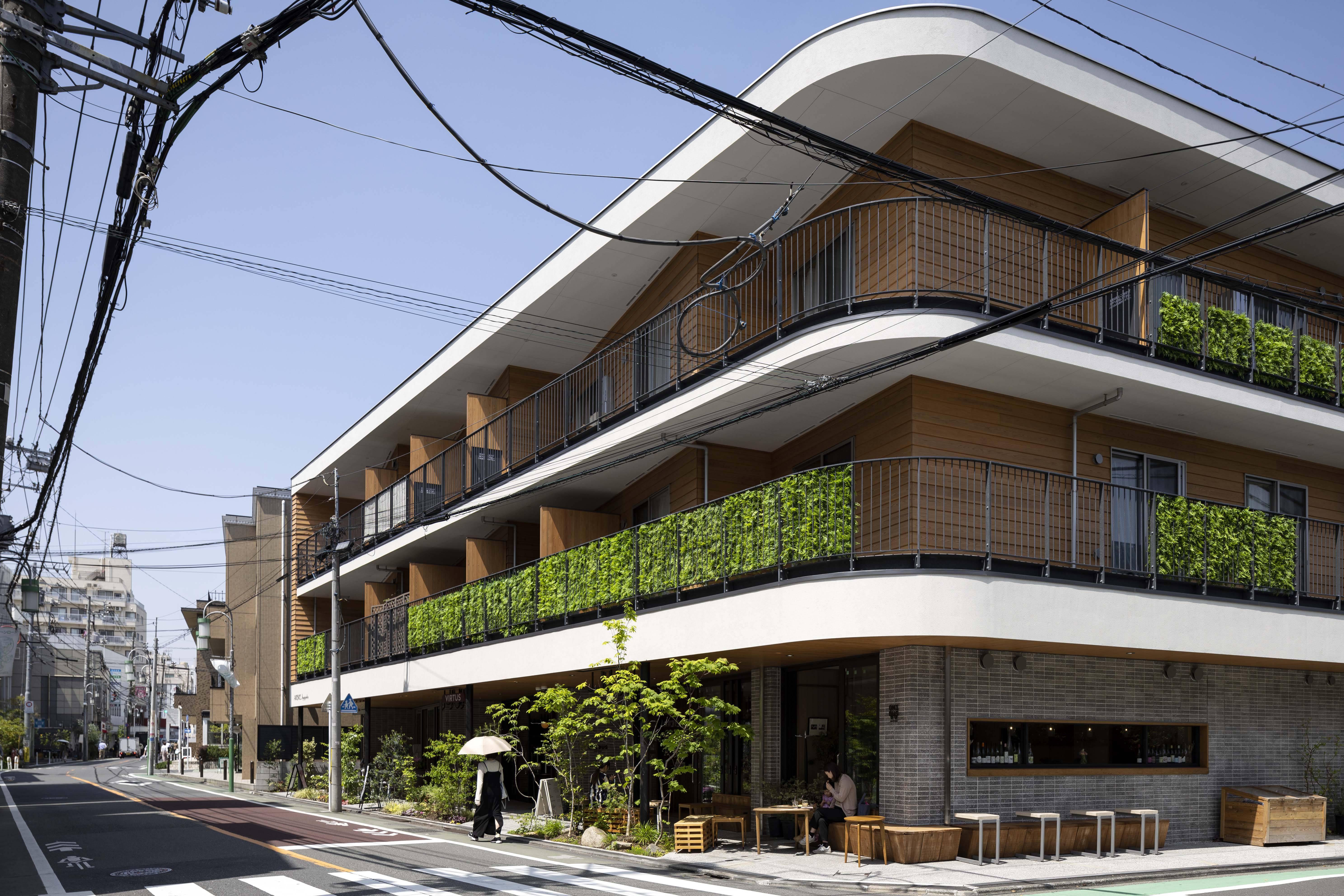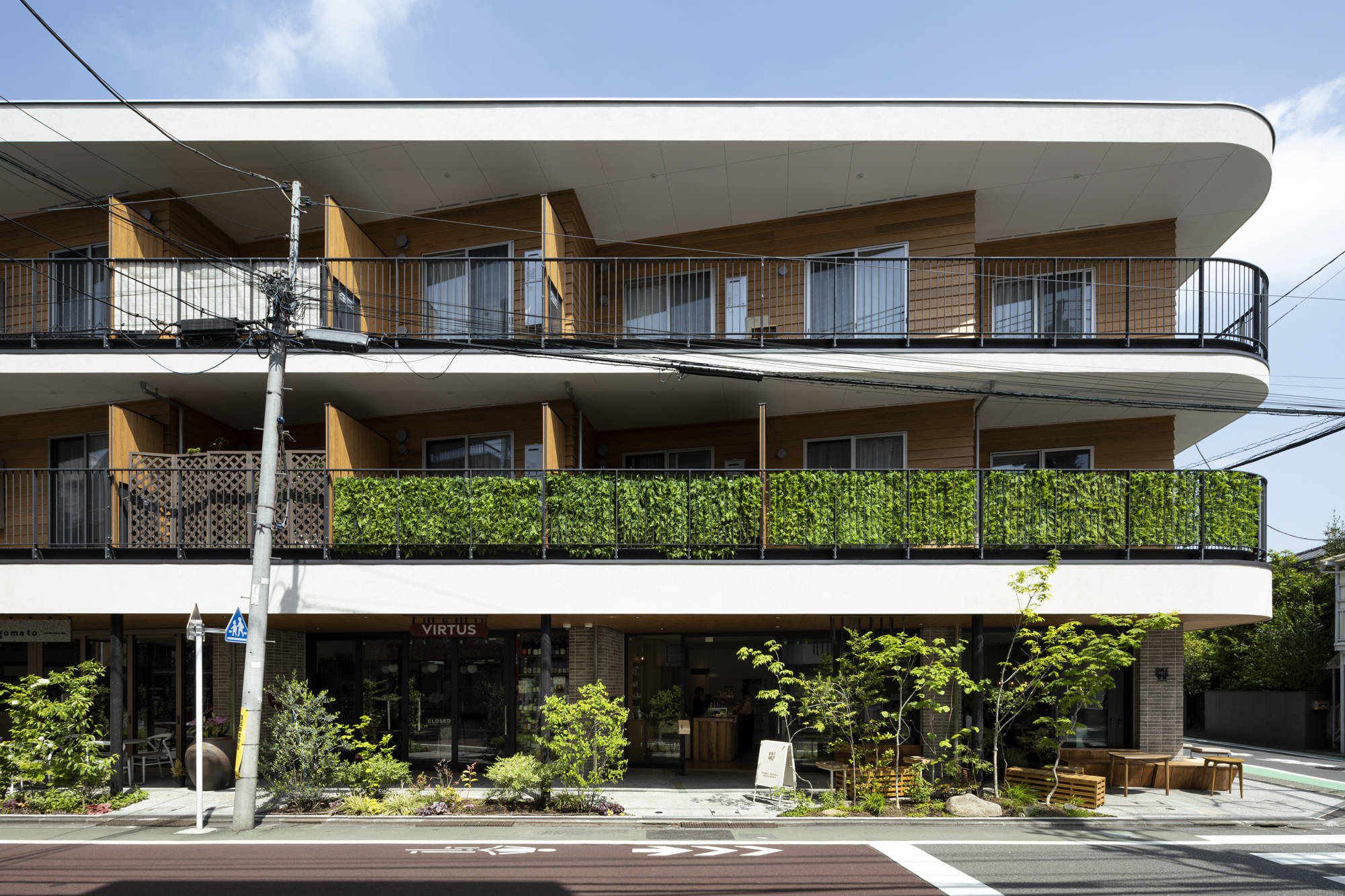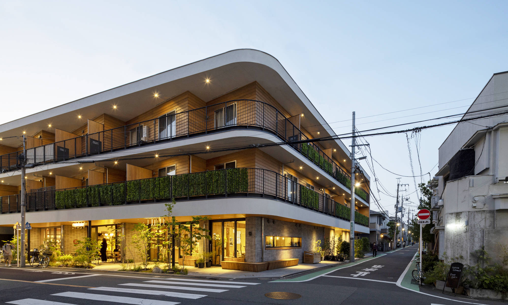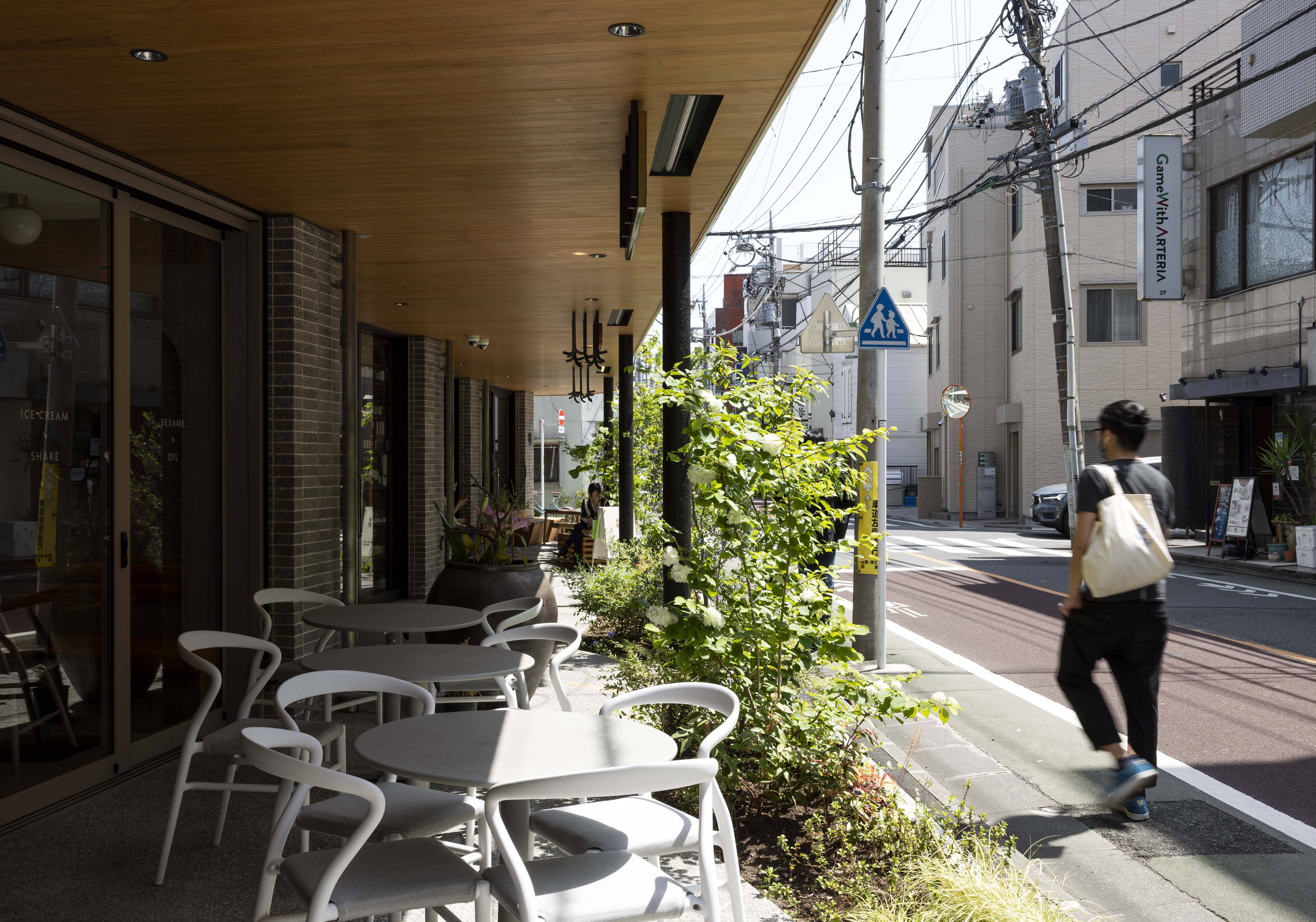 1階は3つのテナント区画が道路に面して雁行する。前面道路の歩道は電柱や街灯があって歩きにくく、それを補う形で広い軒下を設けた。軒下空間は店ごとのまとまりを持ちつつ緩やかに連続し、植栽が道からの適度な距離感を創り出す。2,3階の入居者には1階飲食店と連携したサービスも提供され、テナントエリアも住まいやワークスペースの延長のように感じられる仕組みとなっている。「個室」と「街」の間の空間的なグラデーションが、多様な住まい方を可能にし、コロナ以降、急速に増えてきた多様な働き方を受けとめていくだろう。従来、共同住宅内にとどまっていた住人の暮らし・仕事・交流が街に溶け出し、街を変えていく―自由が丘に生まれた木のまちかどから、そんな未来がはじまることを期待したい。
