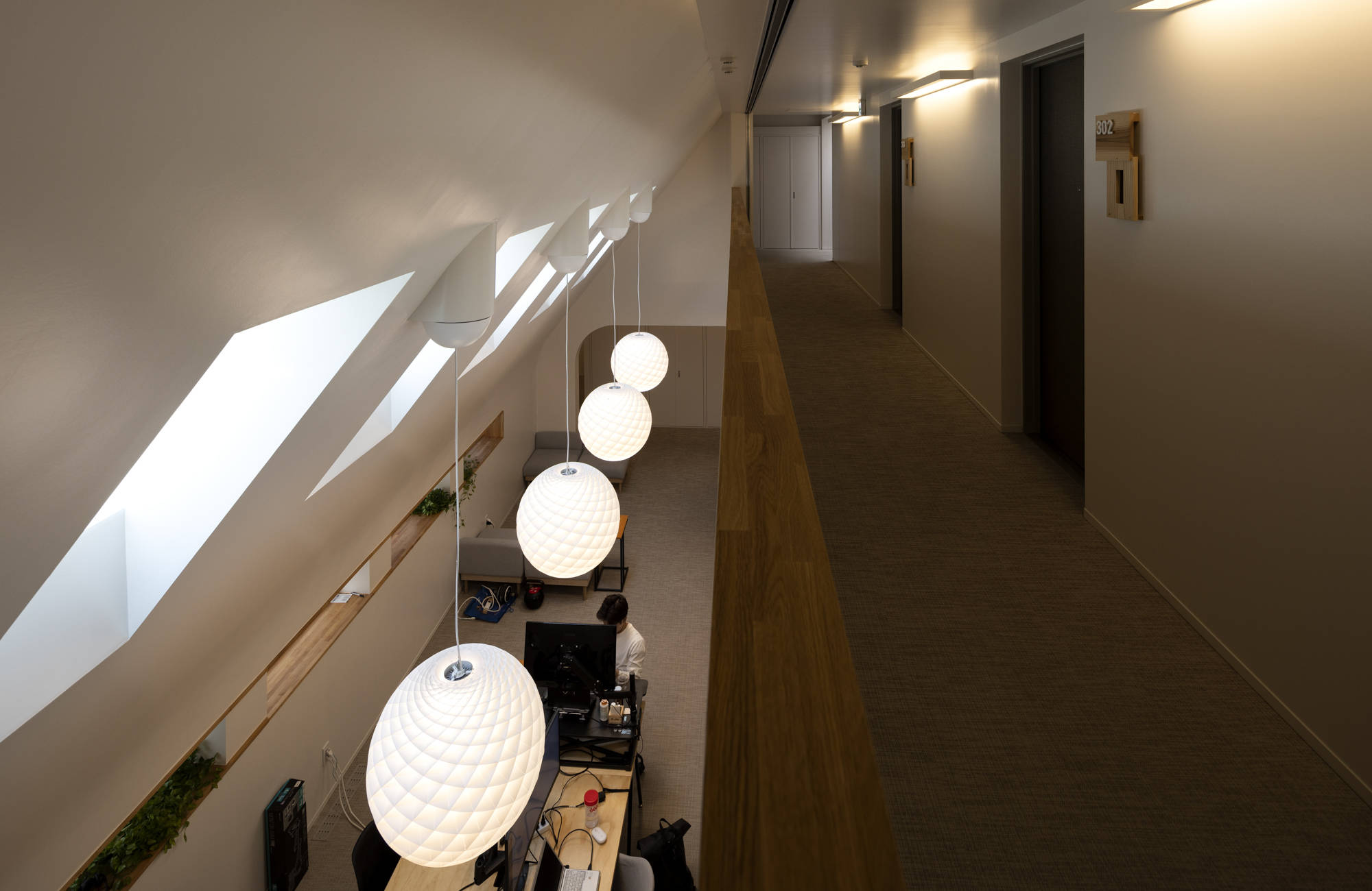 共同住宅はオーナー住戸を含め全12戸。貸室はワンルームと水回りやキッチンをシェアするタイプの貸室が混在し、計22室、加えて入居者同士の交流や在宅ワークの場としても使える共用ホールを設けている。