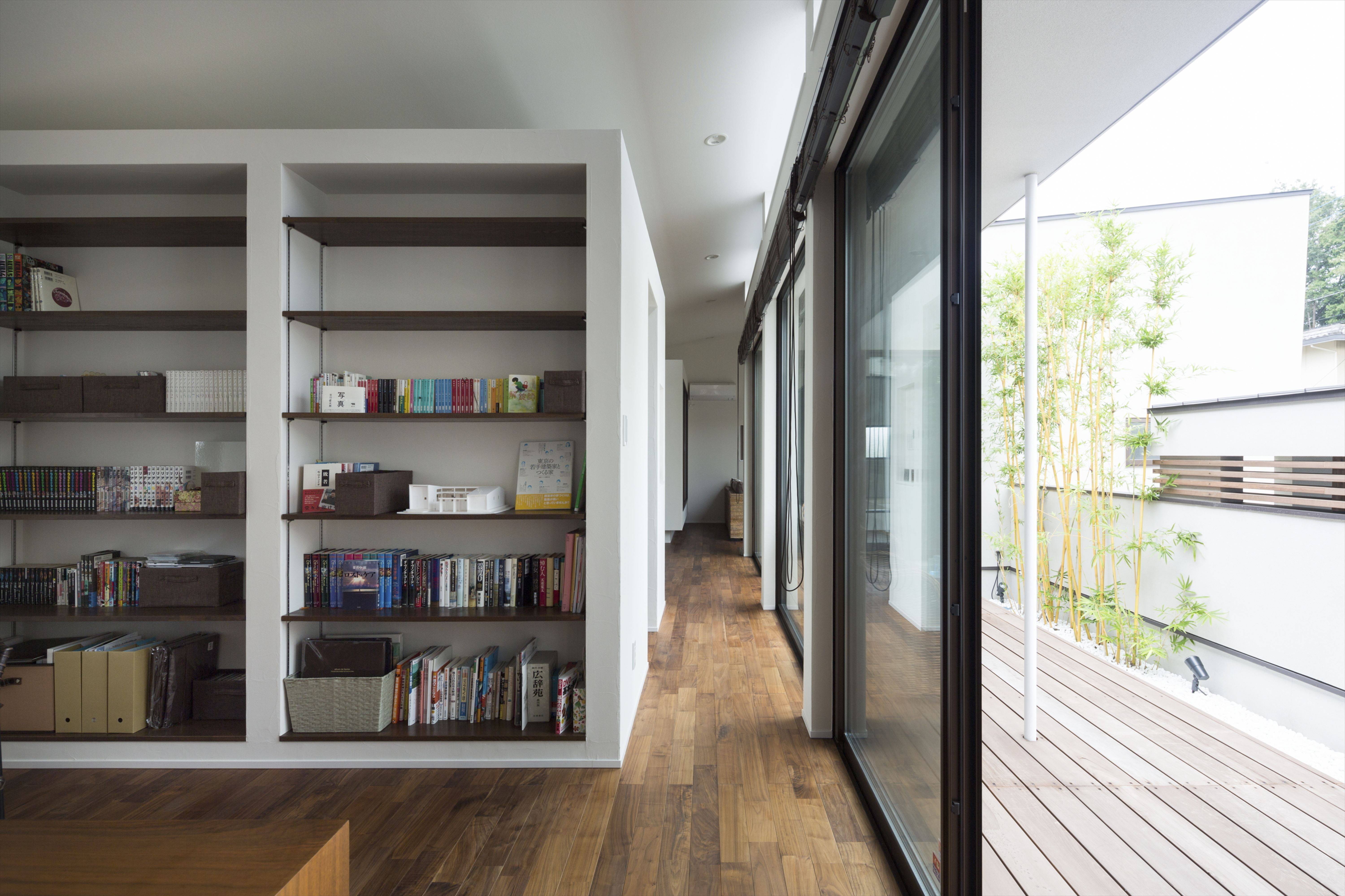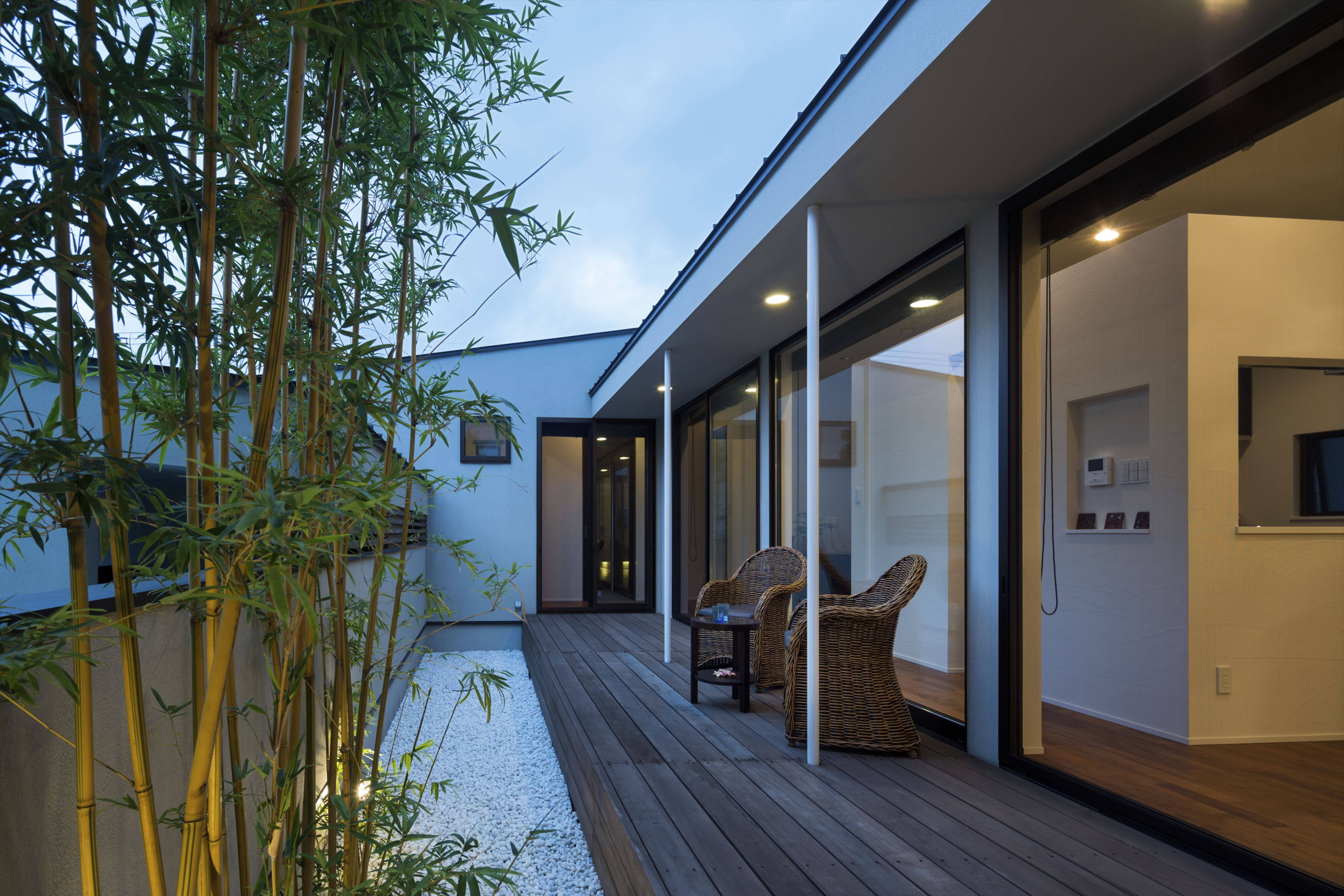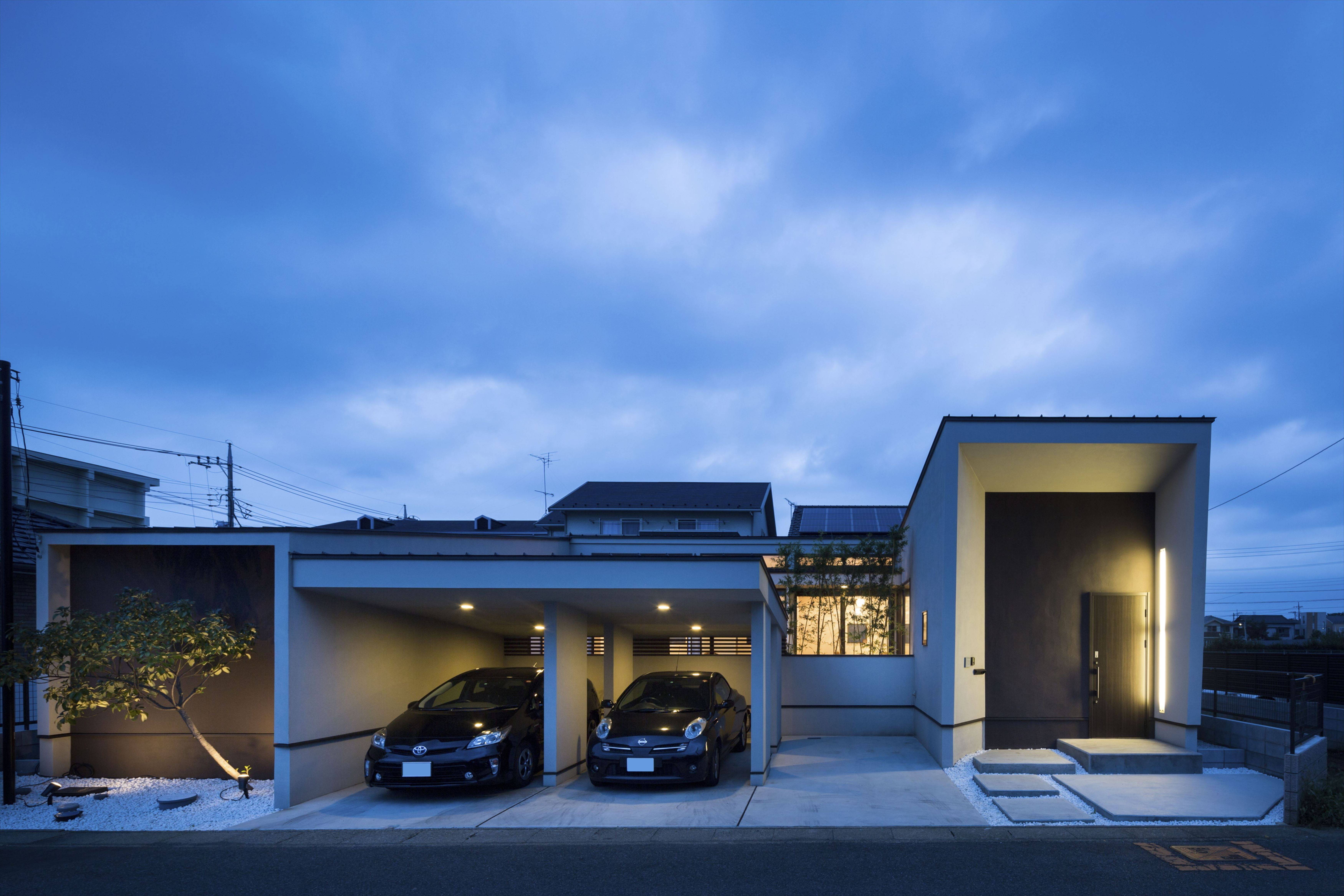 南側の道路に面する2台分の車庫によって中庭をつくりました。