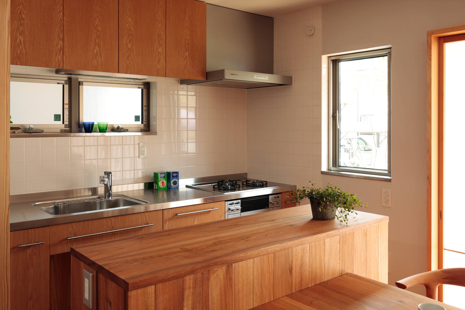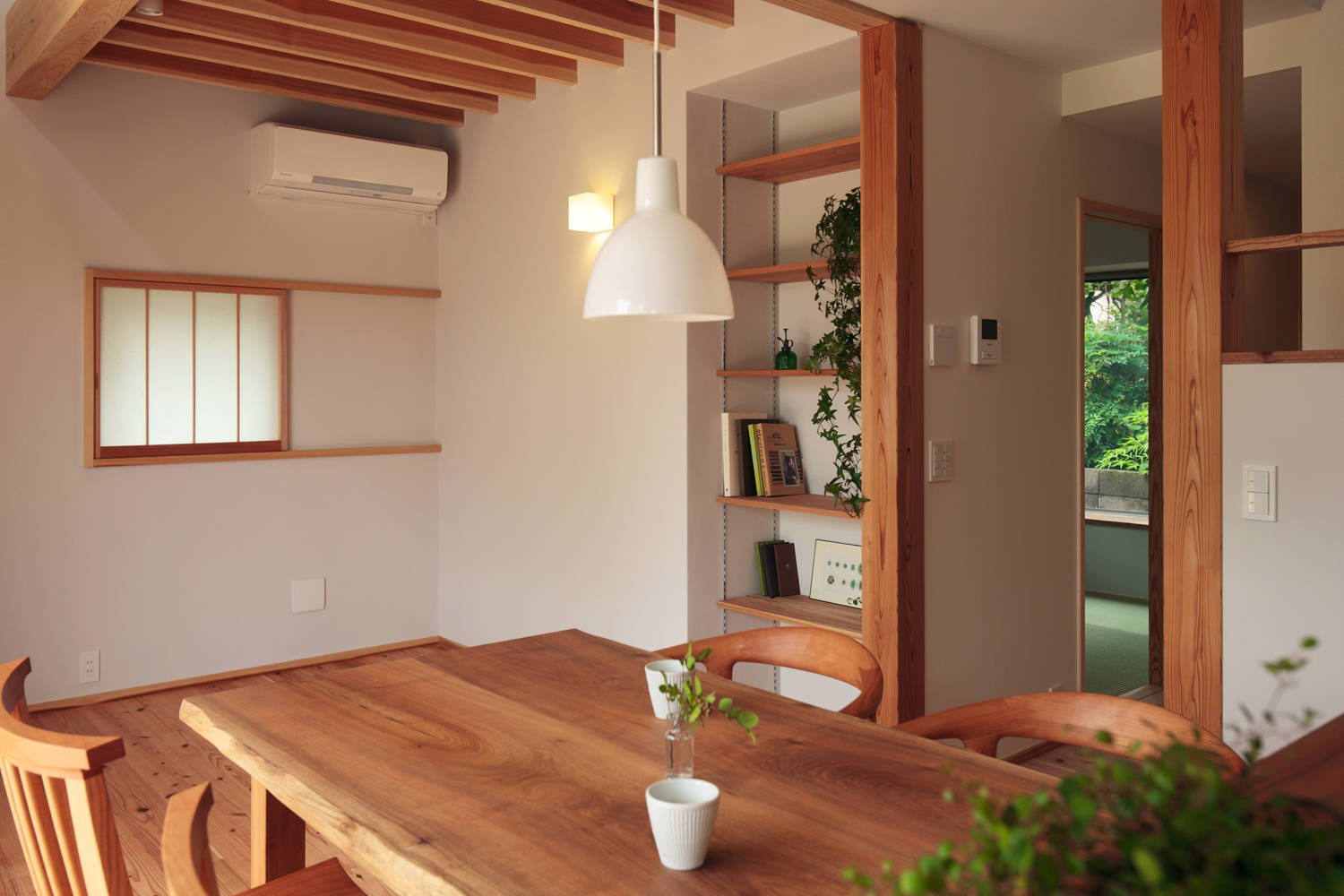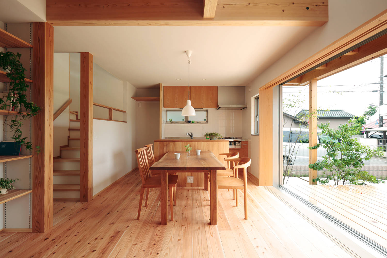 敷地は古くからの落ち着きのある静かな住宅地の一角にあります。南側は比較的人通りが多くない道路なので、明るく日当たりのいい家になるように、リビング・ダイニングは南側に開き、庭の木々に囲まれた大きなデッキをつくりました。