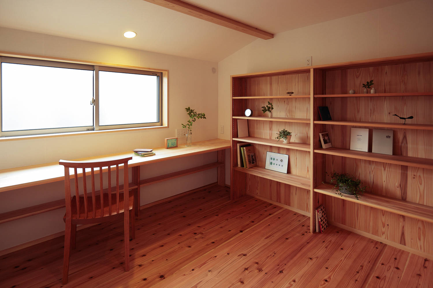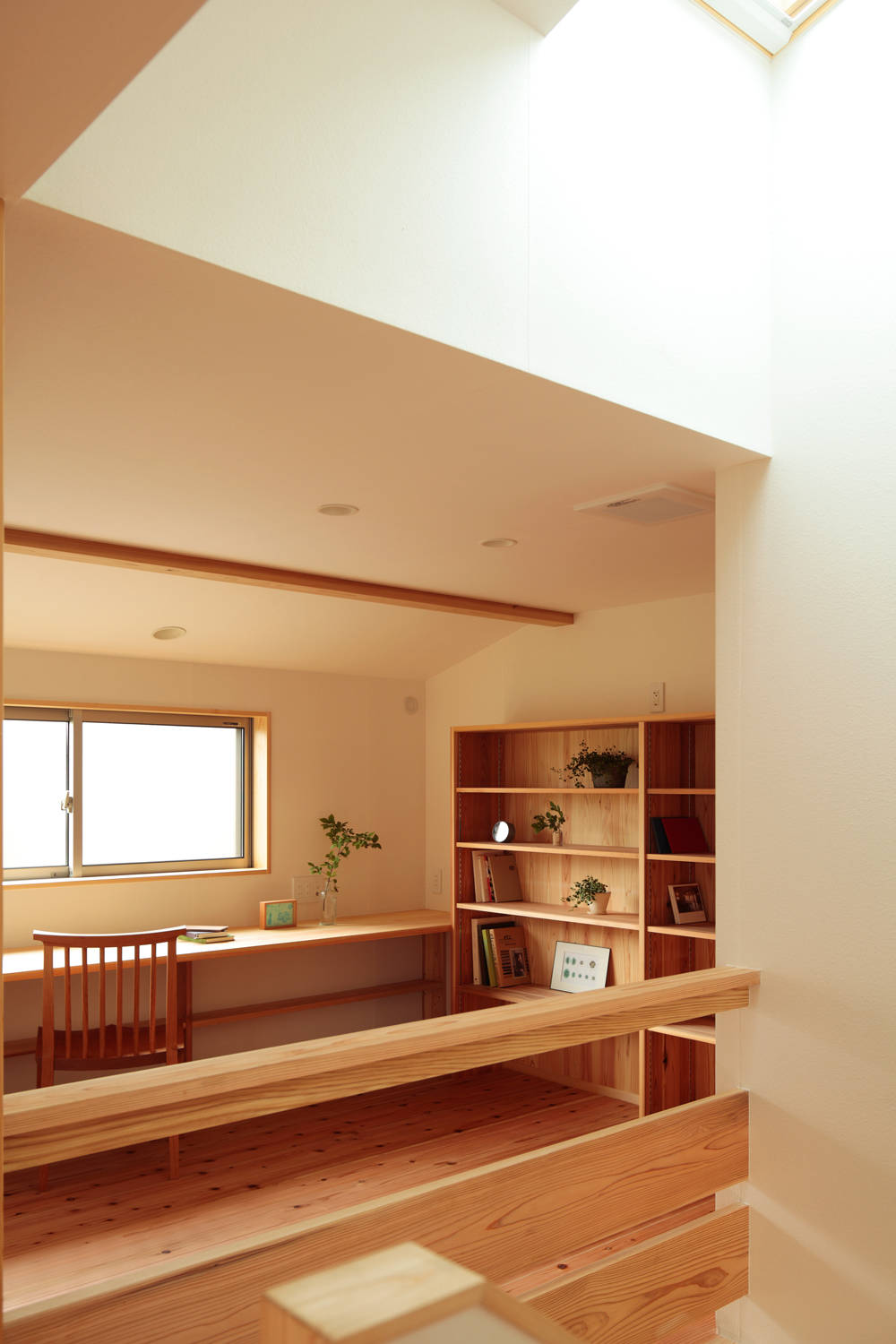 家族にみんなで使う2階の書斎スペースは、階段室を通して1階ともゆるやかにつながり、落ち着きがありながらも孤立しないようになっています。造り付けの本棚やカウンターにすることですっきりとさせています。