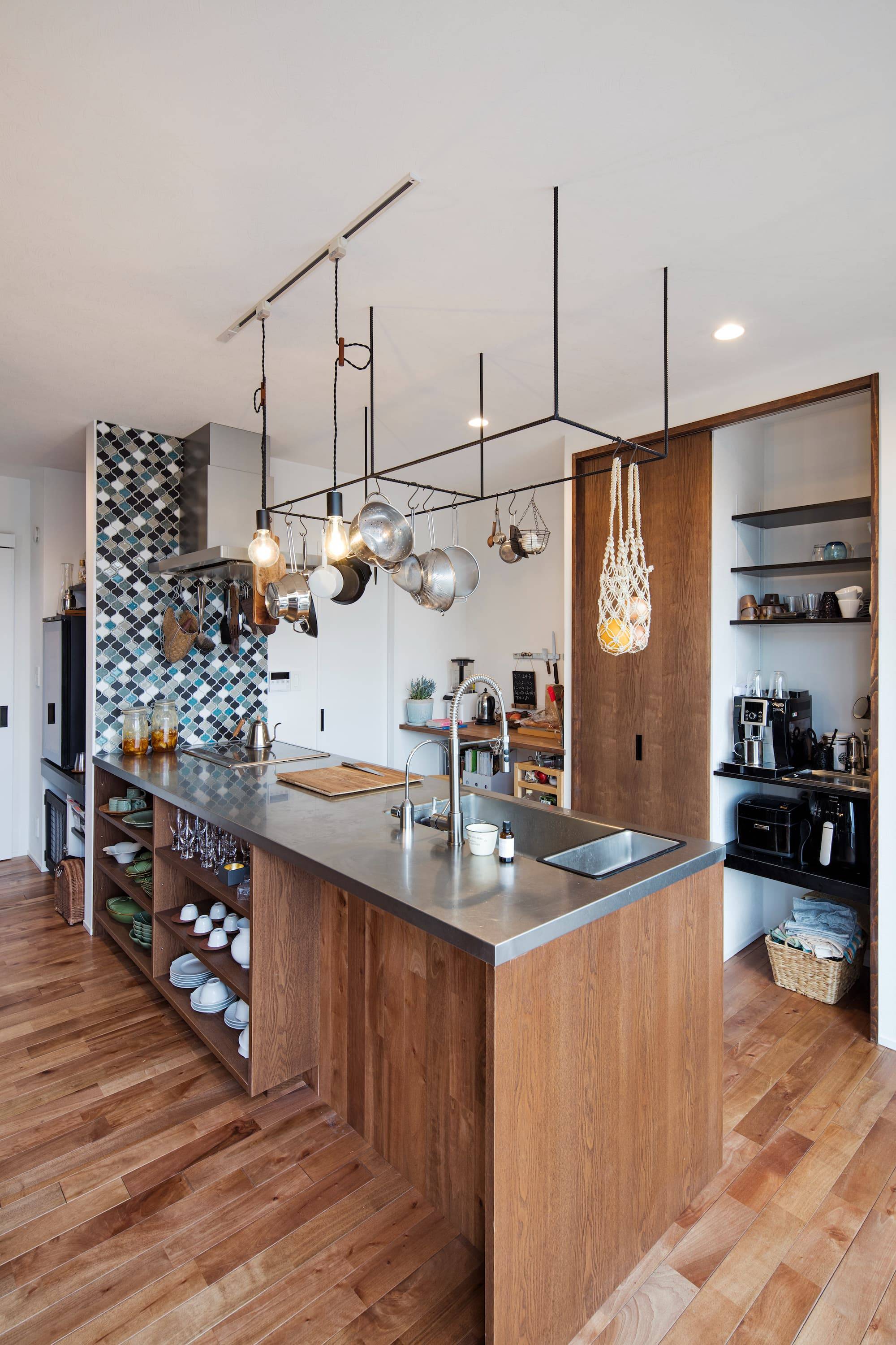 玄関は共用ですが、1階と2階で世帯を分けてLDK、洗面、浴室は各階別に設けています。1階のキッチンを娘さんが料理教室で活用されることもあり、1階には裏動線「プライベートパス」を設けて、ご両親の寝室から収納、水回り、ダイニングキッチンへと子世帯と顔を合わせることなく移動できる動線を確保しました。