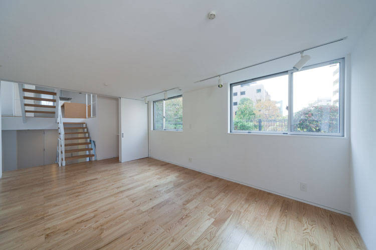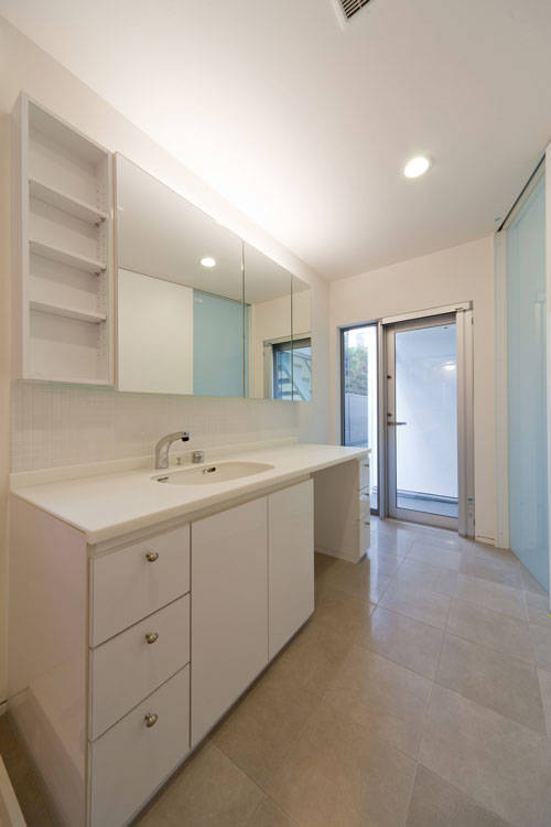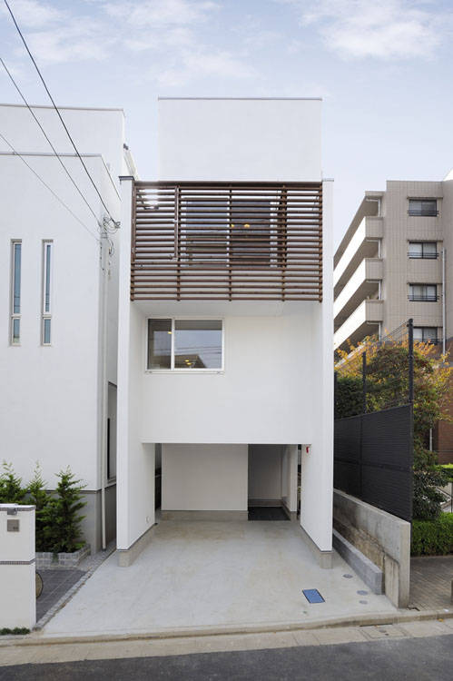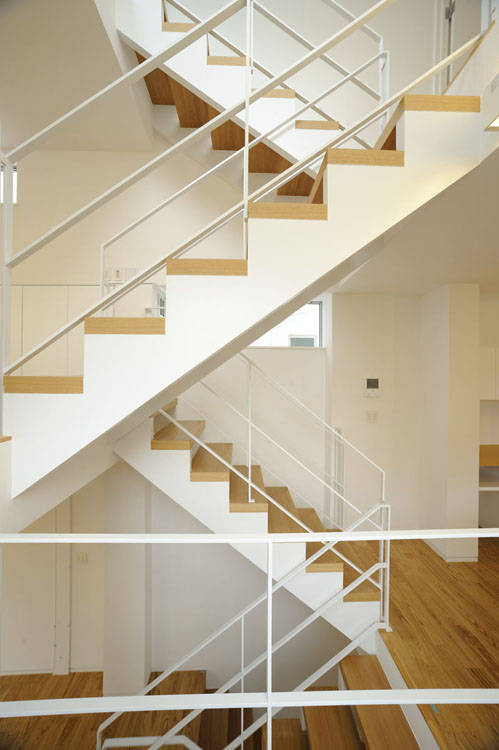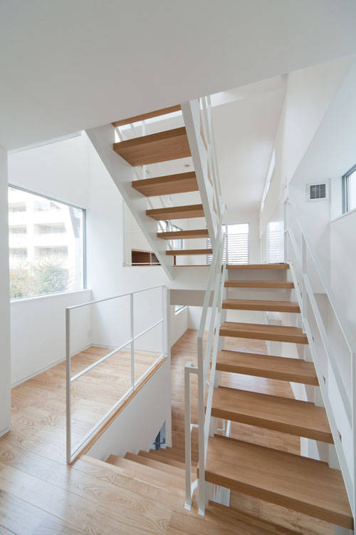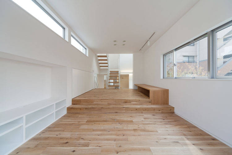 スキップフロア・ハウス。間口5m奥行17mの段差あり敷地。もうここにはスキップフロアの住宅しかない。クライアントのそんな願いから建物間口3.7mの細長3階建てスキップフロア住宅が完成。各フロアに諸室が配置され階段がスキップして空間を繋いでいく。スキップフロアならでは各階が緩やかに繋がり、エントランス・サニタリー・キッズルーム・ダイニングキッチン・リビング・寝室・・・行き着く先はルーフテラスへと。階段を通常の半分昇れば部屋があるため、疲れず快適。フロアから上下半分ずつ繋がる部屋が見えて、家族が近い住宅になりました。間取り図だけでは絶対に分からない空間の楽しさがそこにあります。