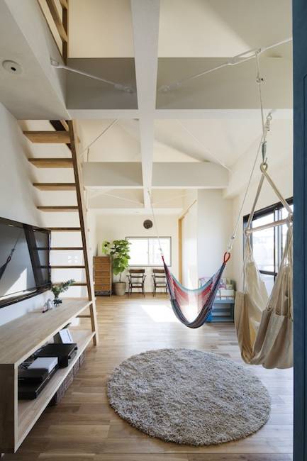 料理教室ができるダイニングキッチン、アロマテラピーが 寝室、子供達と共に楽しむボルダリングウォールとハンモック。