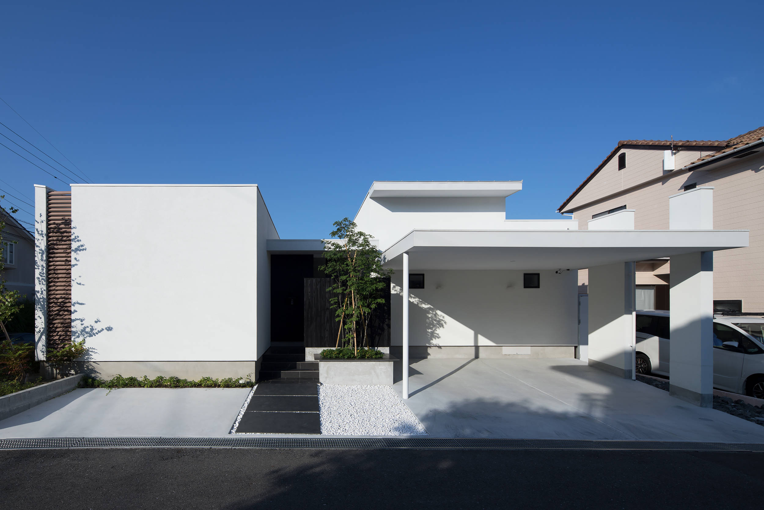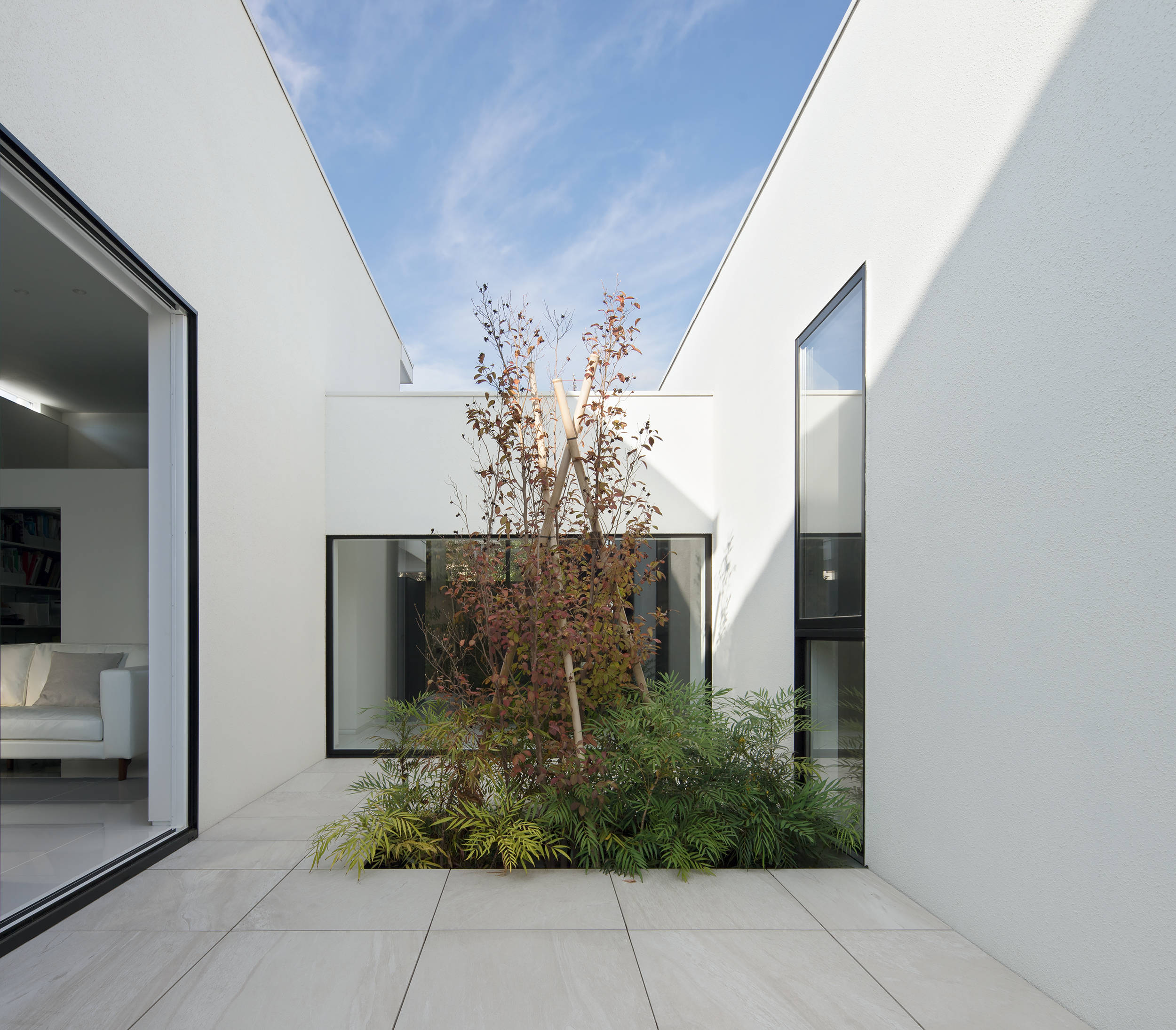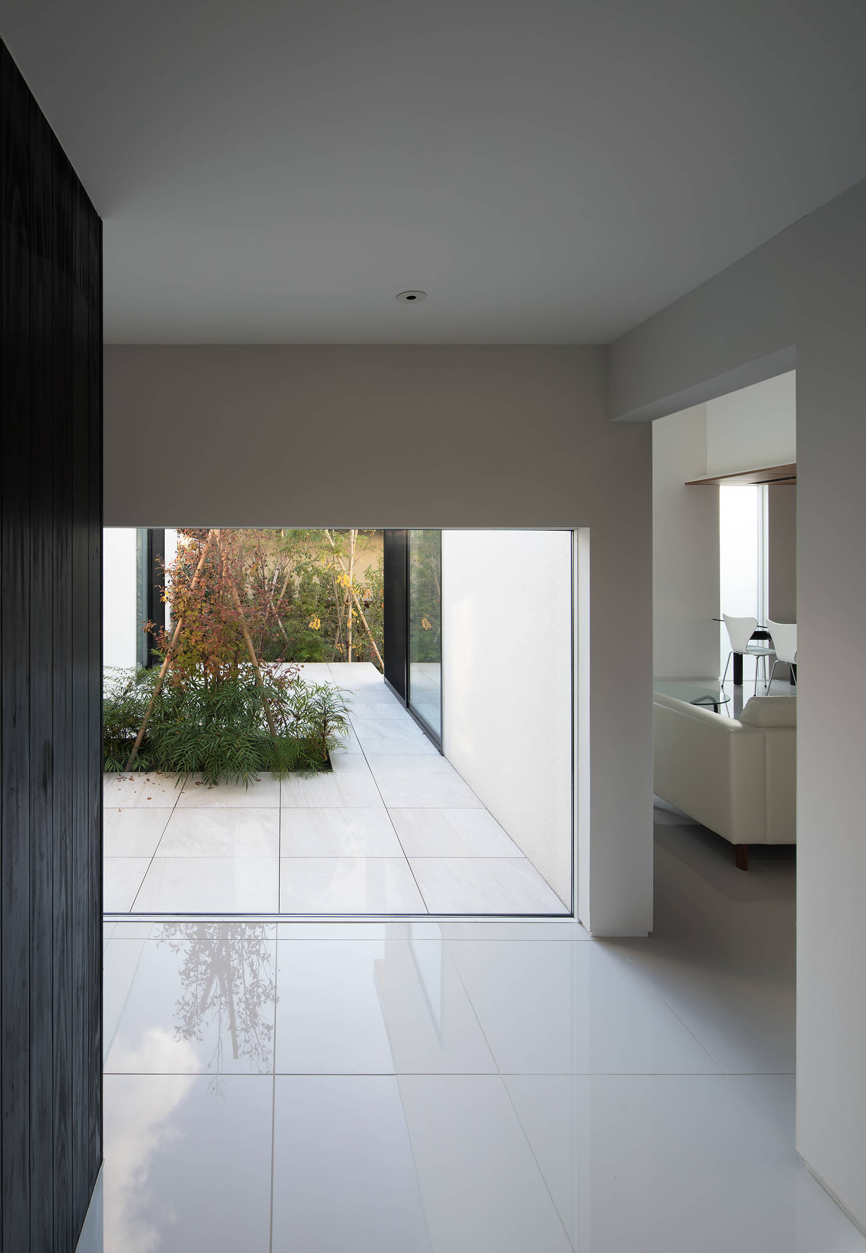 2つの箱は、角地としての周囲の視線から中庭に開いたプライバシーを守る役割が持たされ、来訪者は棟間のエントランスホールから中庭の風景をピクチャーウインドウを通し眺めることができる。
