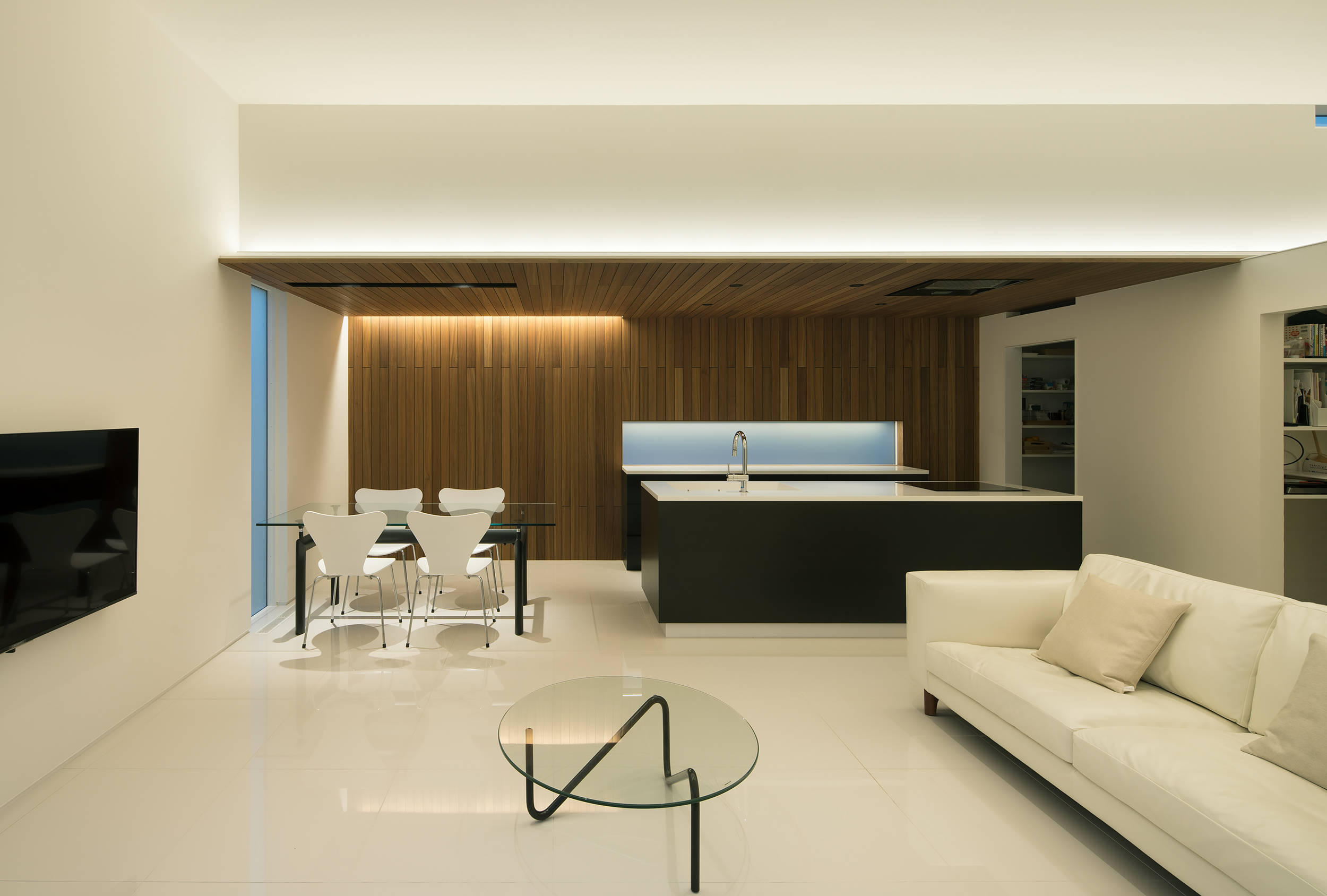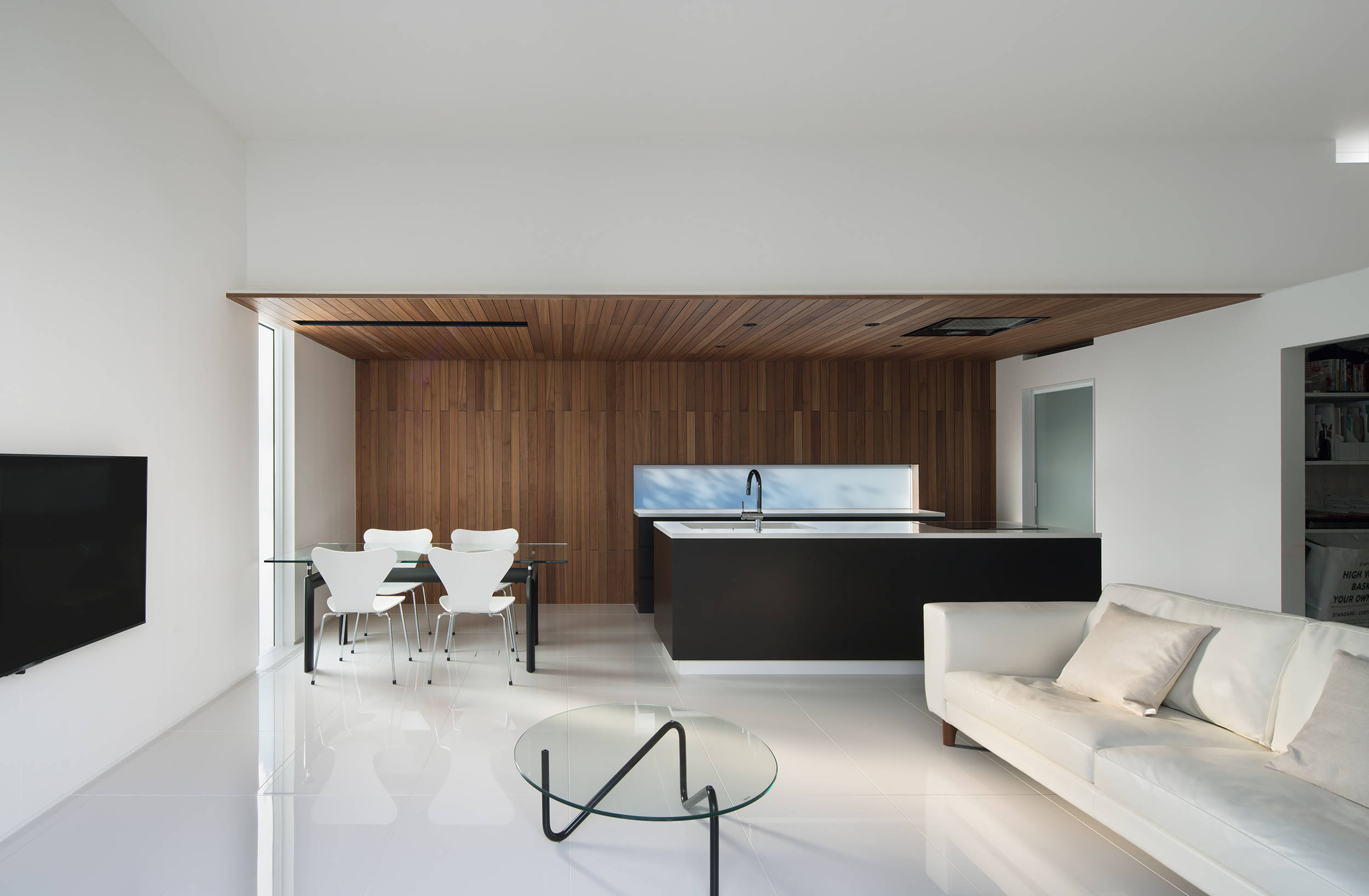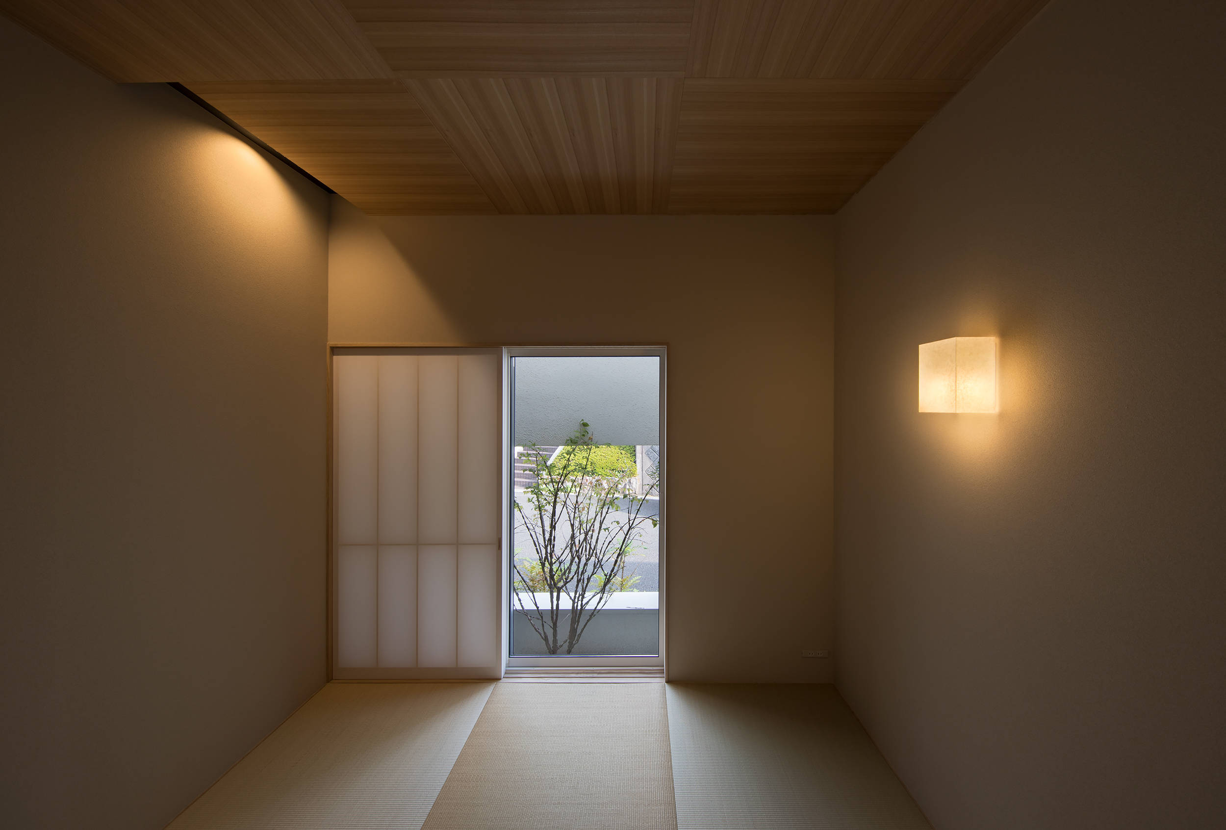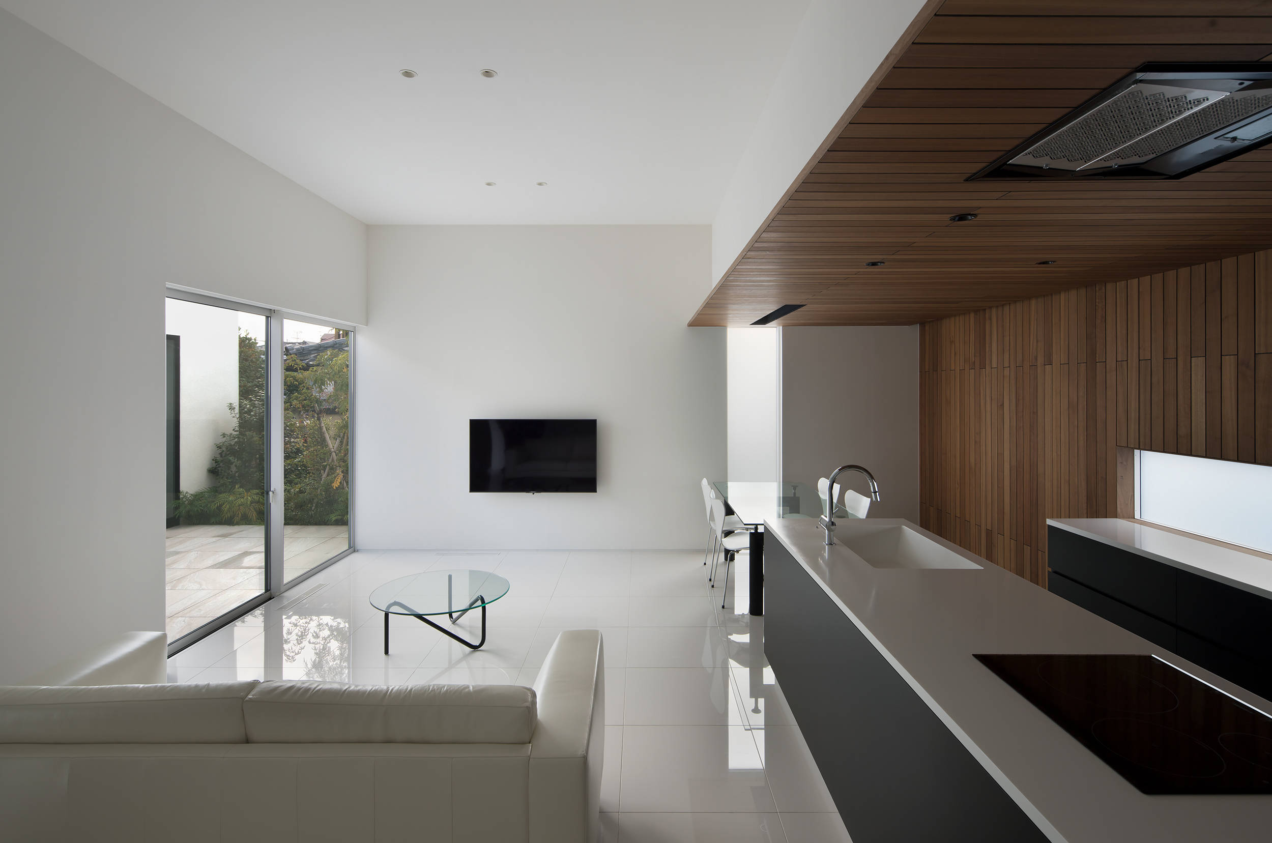 2つの箱は、角地としての周囲の視線から中庭に開いたプライバシーを守る役割が持たされ、来訪者は棟間のエントランスホールから中庭の風景をピクチャーウインドウを通し眺めることができる。