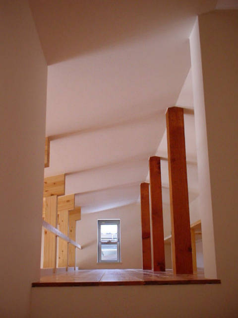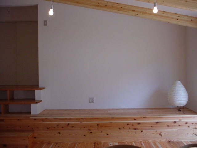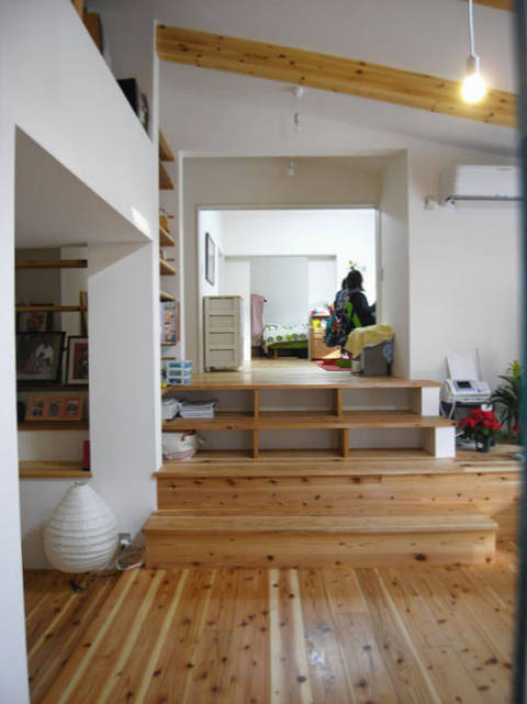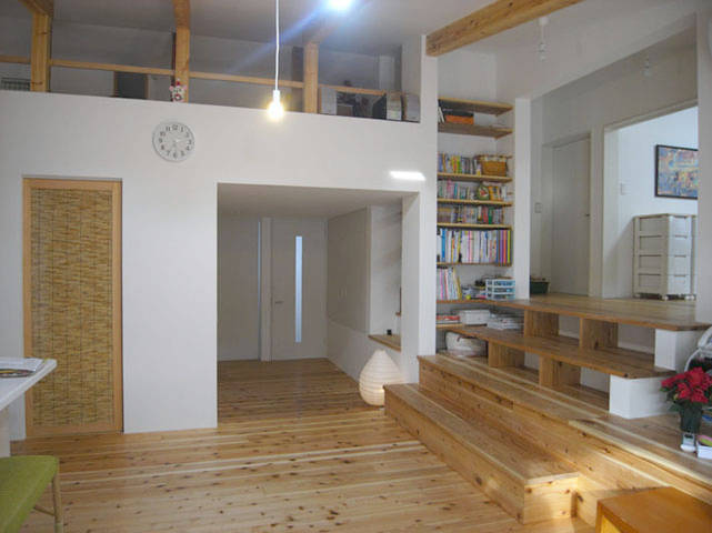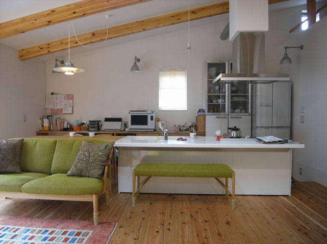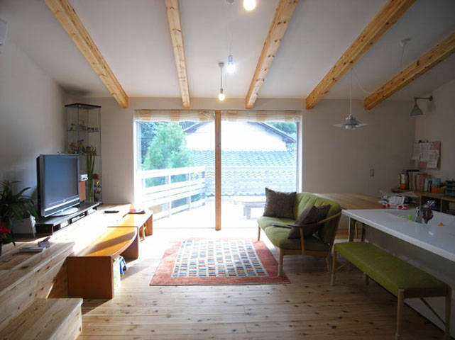 一部母屋を新たに子供室として離れとつなげ、母 屋・離れ間の段差を利用し、スキップフロアとして階段コーナーをベン チや本棚、テレビ棚として使えるようにしている。勾配天井にして広くなったLDKは、小屋裏だった空間をロフトにしてアイランドキッチンを中心とした漆喰塗の空間とし、それによって風通しがよくなった。床の板が新たに増築した外部テラスまで続いていく。テラスからは庭から続く裏山が間近に臨める。