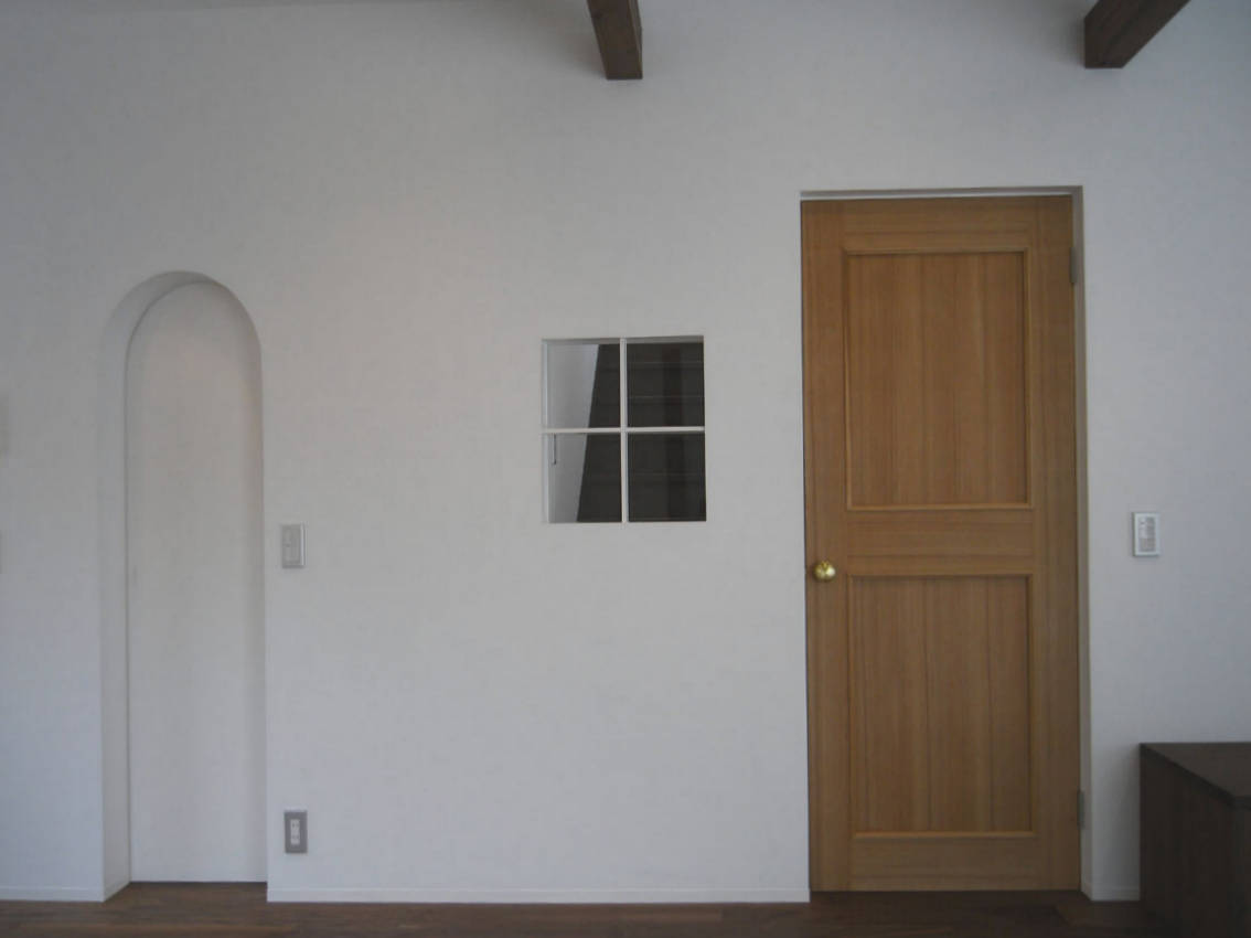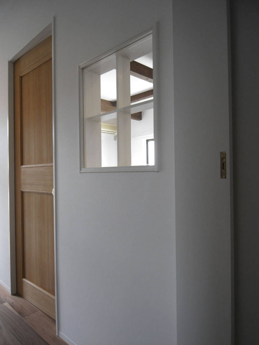 室内窓は、階段踊り場の窓から差す明かりを取り込むためのもので、冬になるほど深く差し込むため、窓や扉のスケール感はDKは小さめでこじんまりとした落ち着きのある雰囲気に。それによって、リビングでは伸び やかで開放的な雰囲気になるようにした。さらに構造補強の梁や、低く長いテレビ台により空間を伸びやかにしている。