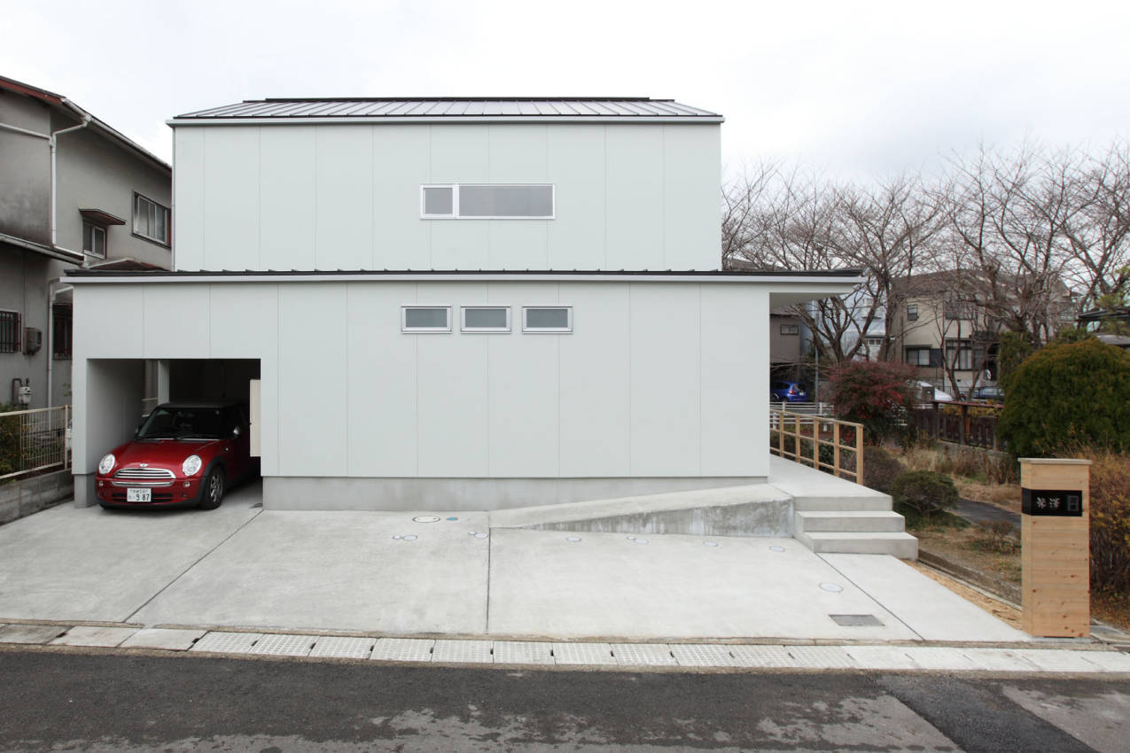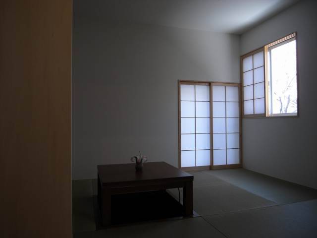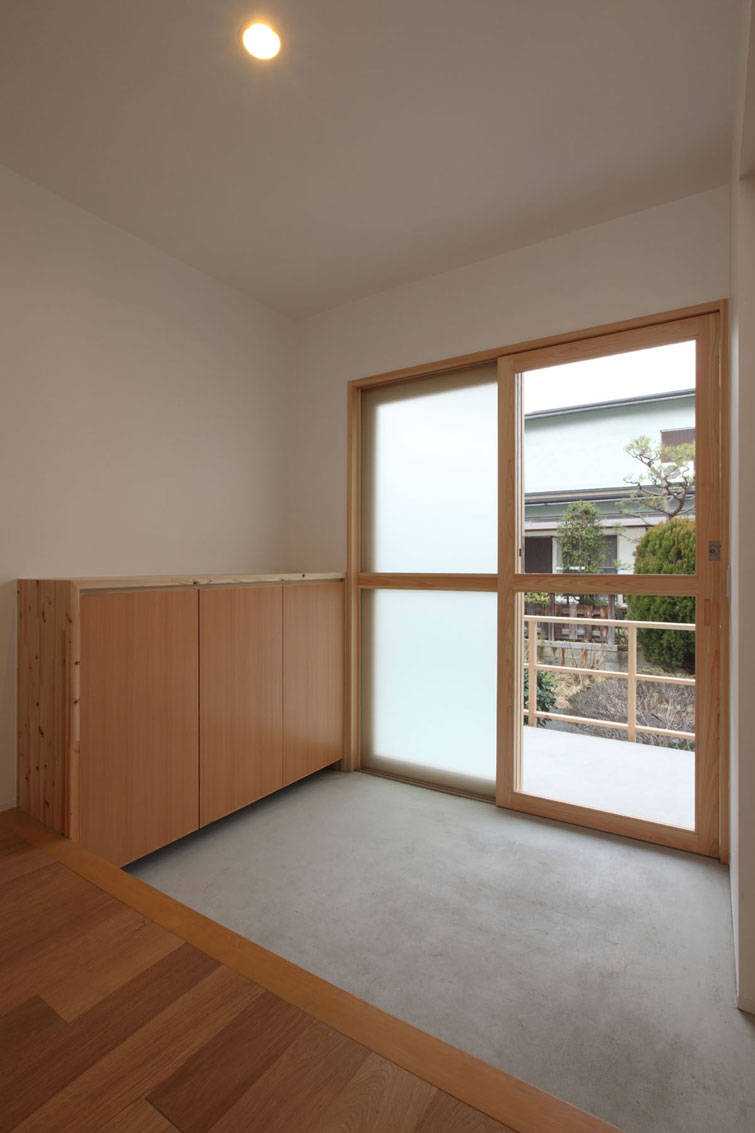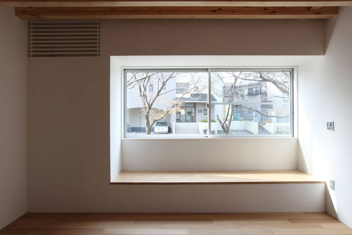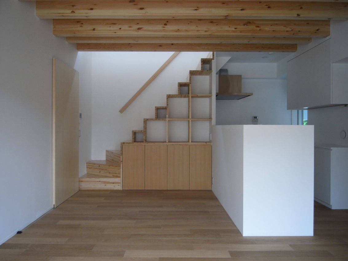 外観は桜並木の雰囲気を共有するように、境内のような柵や手摺の格子がシンプルな建物に並木のリズムを引き込む。内部空間の露出の梁、箱階段、障子、梯子にそれは静かに連動し、空間を形成する。二世帯が同居する計画であるため、親世帯が不自由なく生活できるように、LDKと親の個室と水廻りスペースが1階で完結するようになっている。