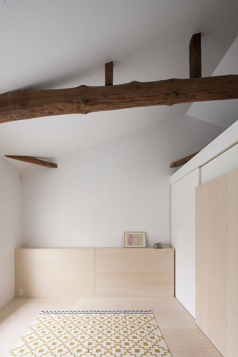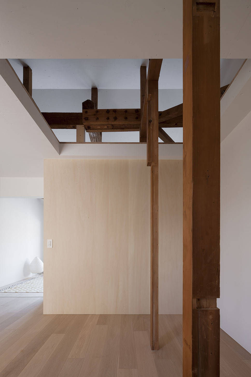 既存の構造体から恣意的にずらしながら新たに挿入した構造体や補強材は白く塗装し、時間的前後関係をつくり出しながらも機能として共存させ、ぶつかり合うことなく自然に解け合っていくような状態を目指した。