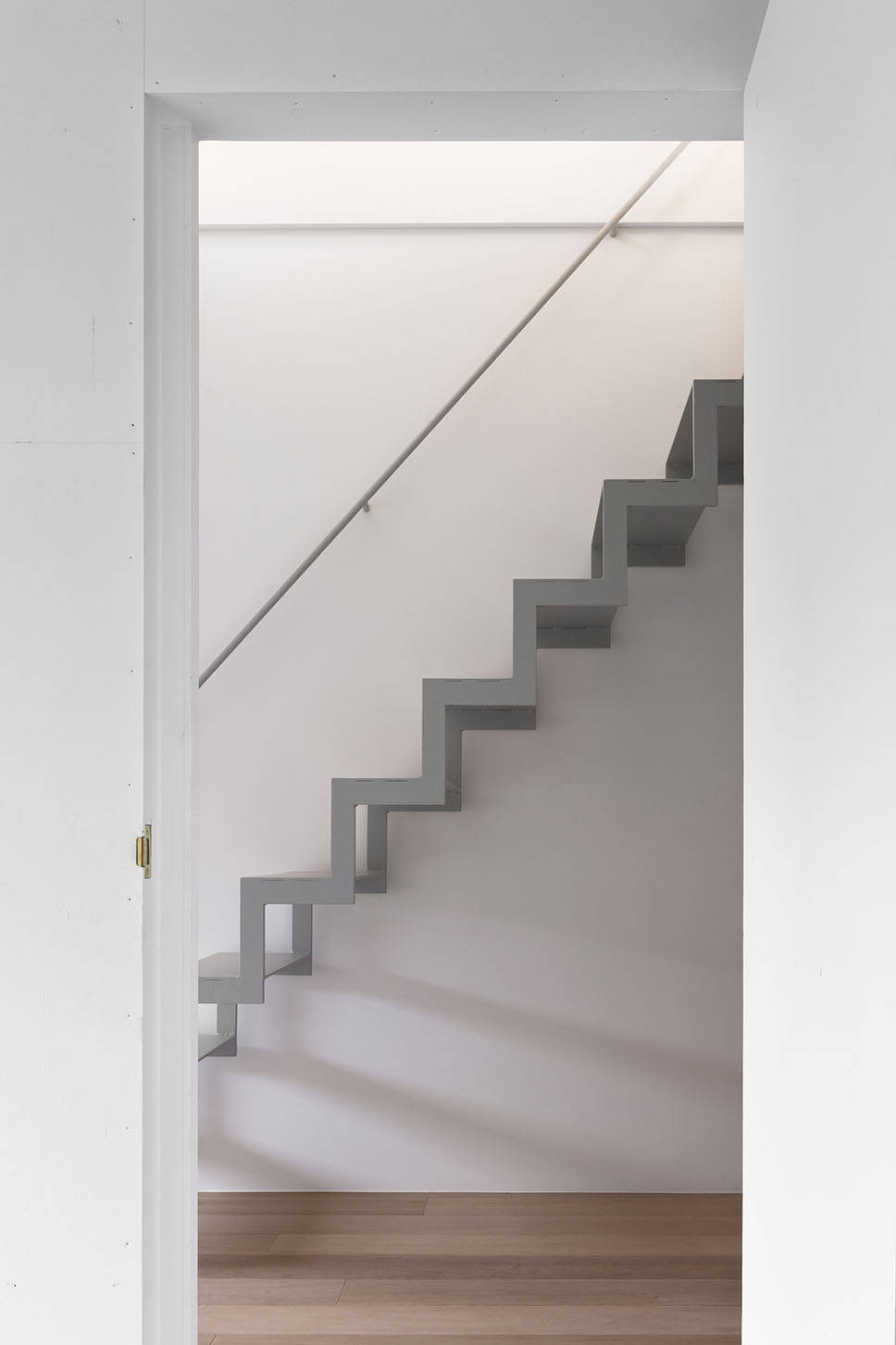 ヴォリュームに開けられた開口や隙間からは全体像を見え隠れし、そのヴォリューム自体も白く塗装しテクスチャーのみを浮き立たせて、空間に奥行と広がりを与えることを狙っている。