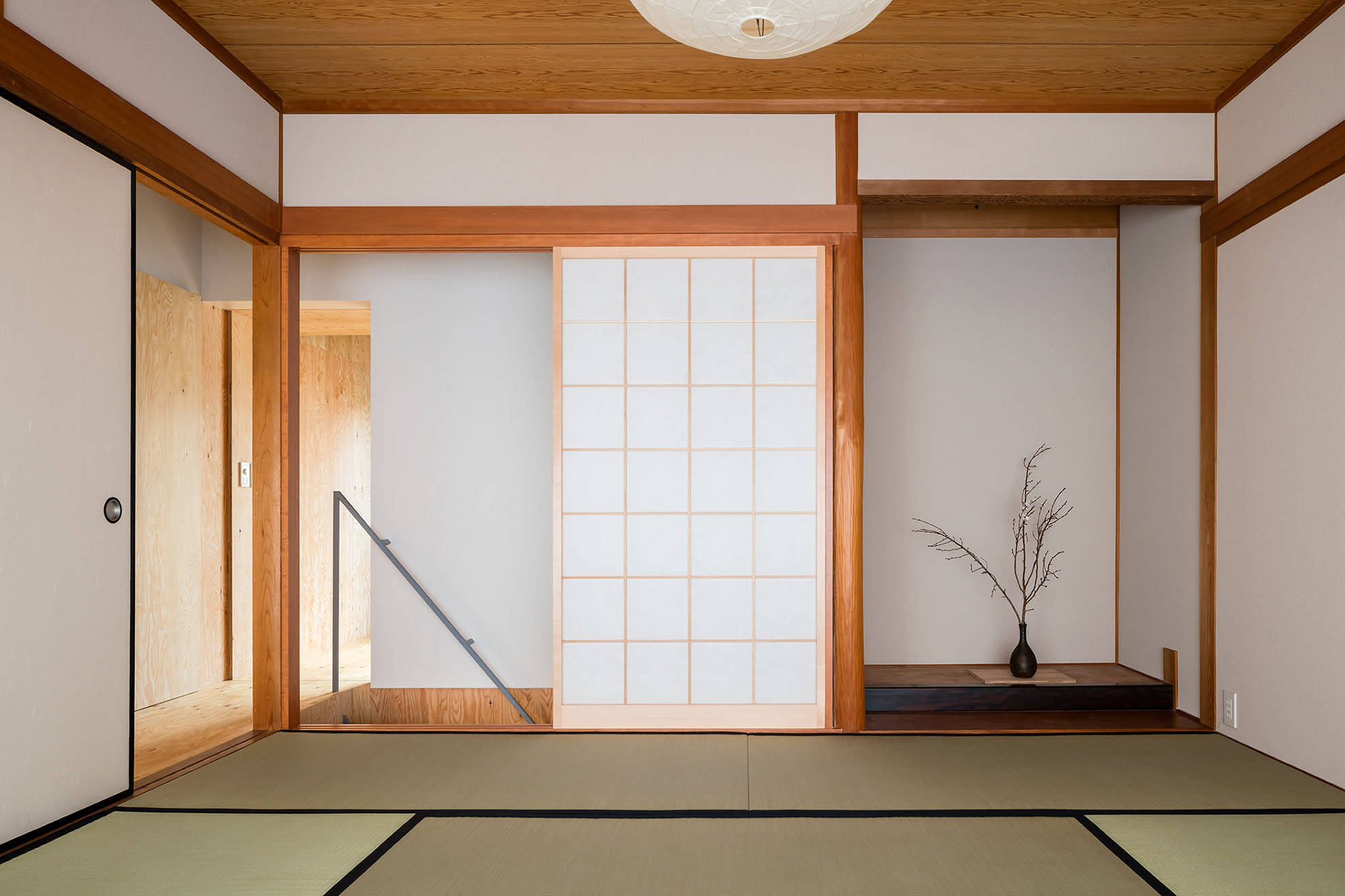 動線に囲われた暗くなりがちな空間には、階段室と和室の壁面を撤去し、透過する障子により階段吹抜けから採光を確保、内からも外からも採光できる明るい回遊空間が実現した。
