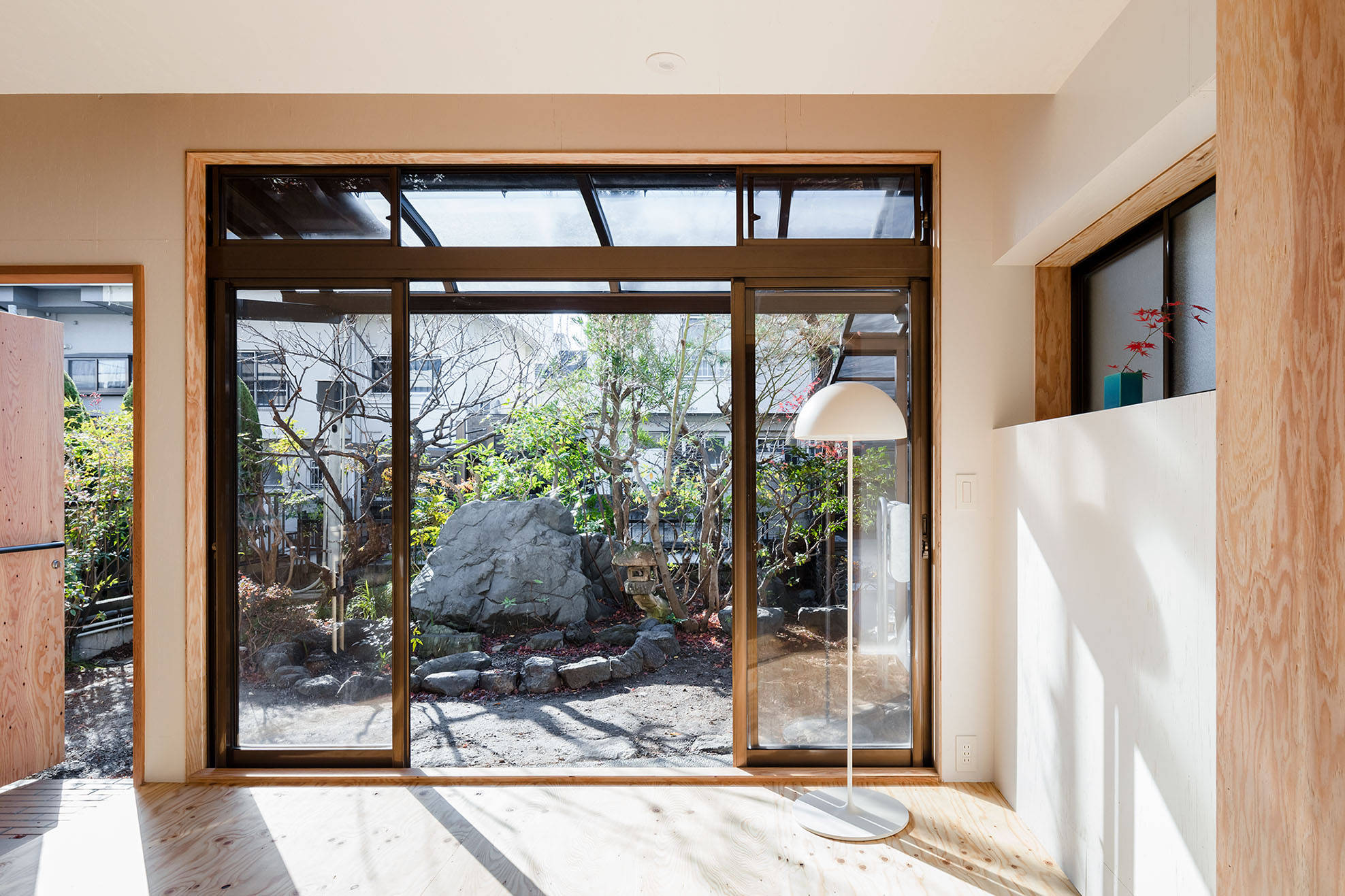 矯正された庭からは光が入り、白く塗装された壁により乱反射し室内に光を取り込む。