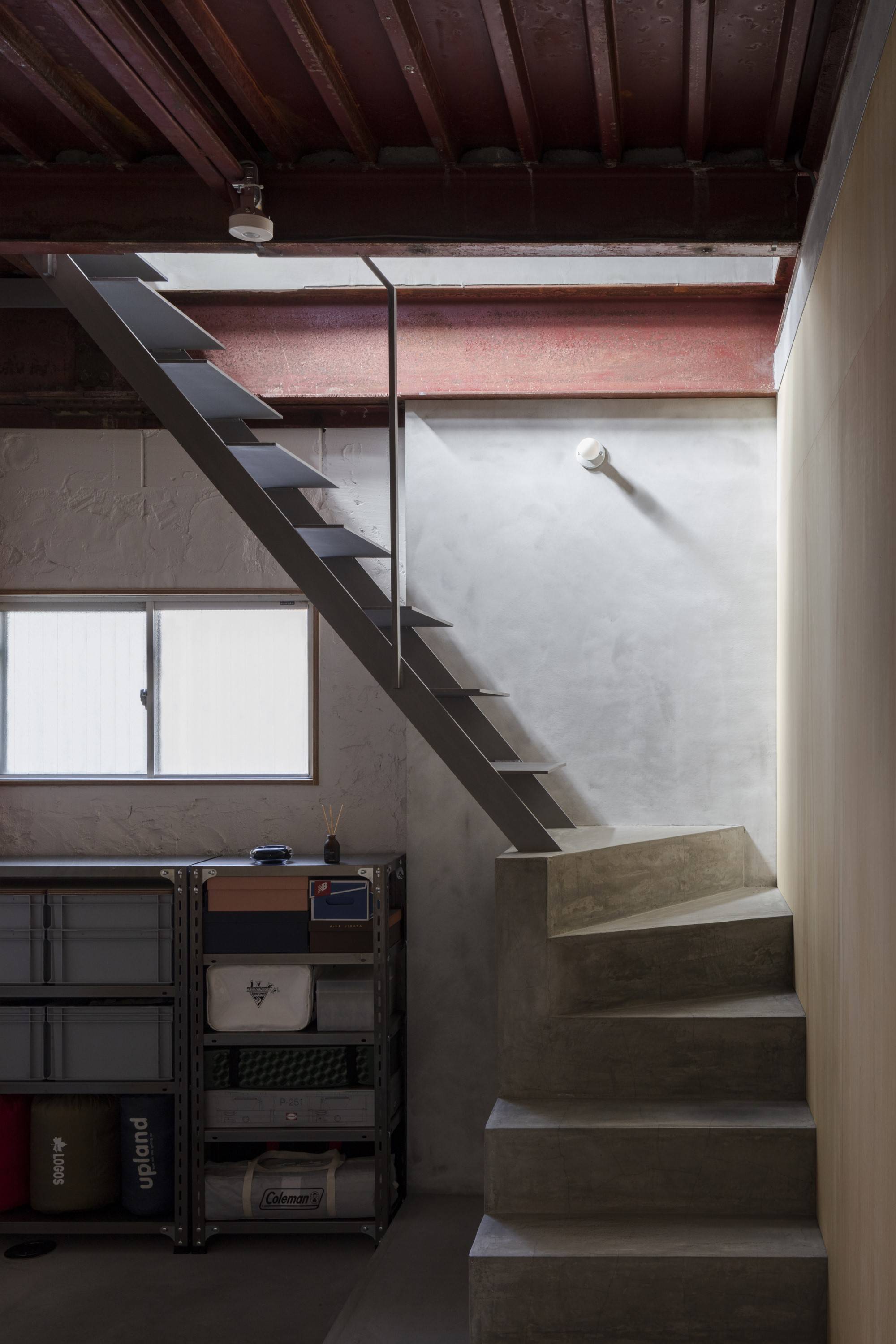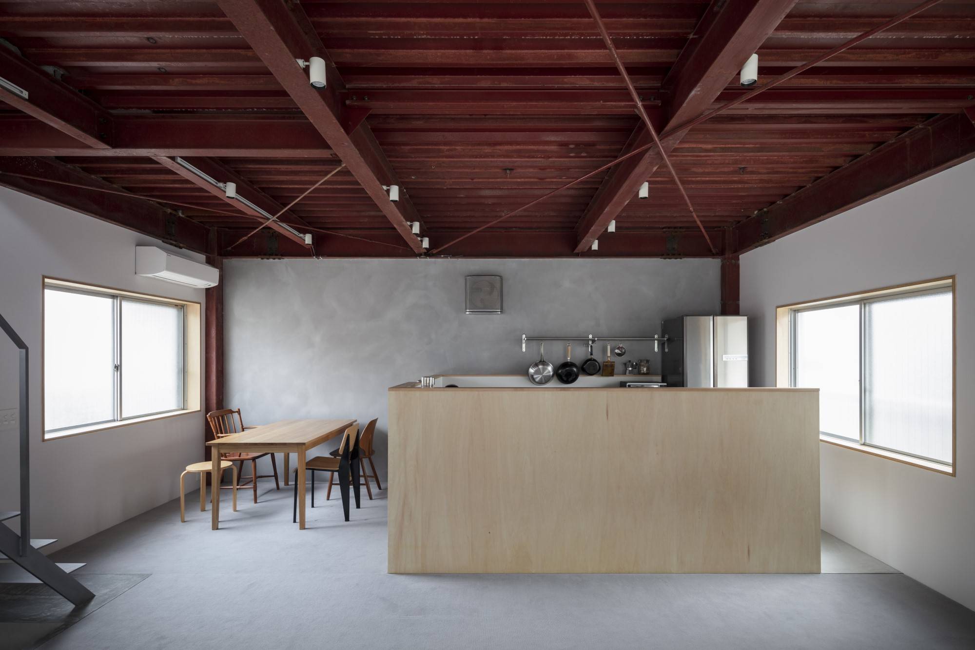 緩やかに仕切られた各フロアの空間は、各壁面に開けられた不規則な既存の窓によって、さまざまな方向から採光と通風が行われ、土間を通り抜ける。