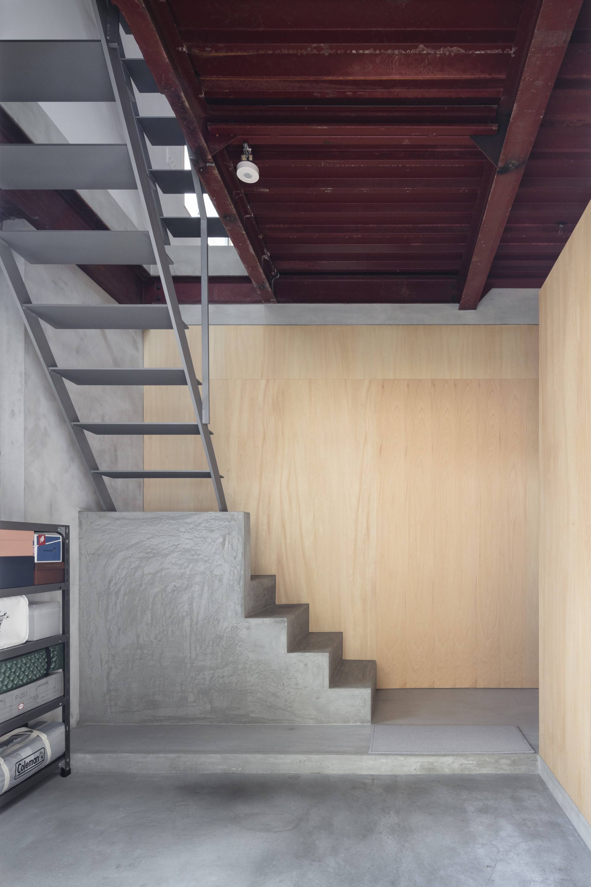 2階、3階の屋外空間であるバルコニーに着目し、これらと1階の土間を階段で接続させ、土間が立体化したような空間構成とした。各フロアは、納戸、キッチン、絨毯、寝室、階段など生活に必要な機能を、家具が置かれるように、立体化した土間に配置した計画である。