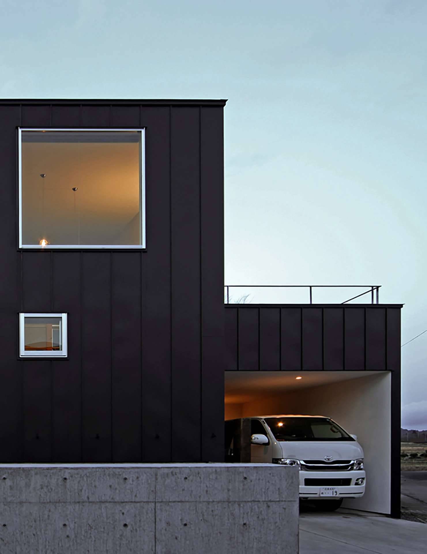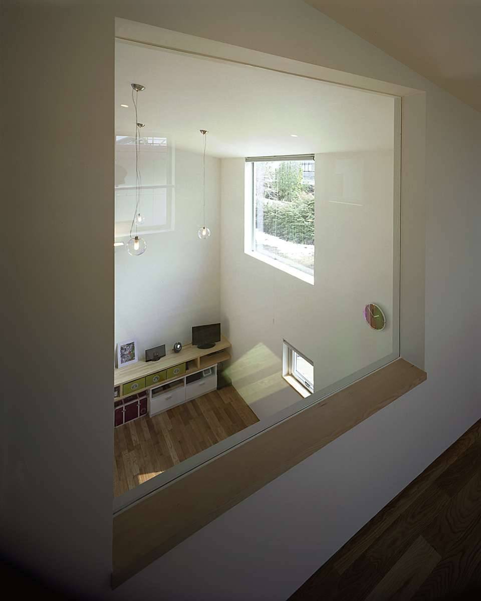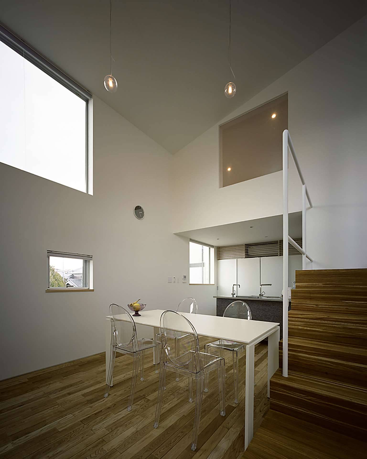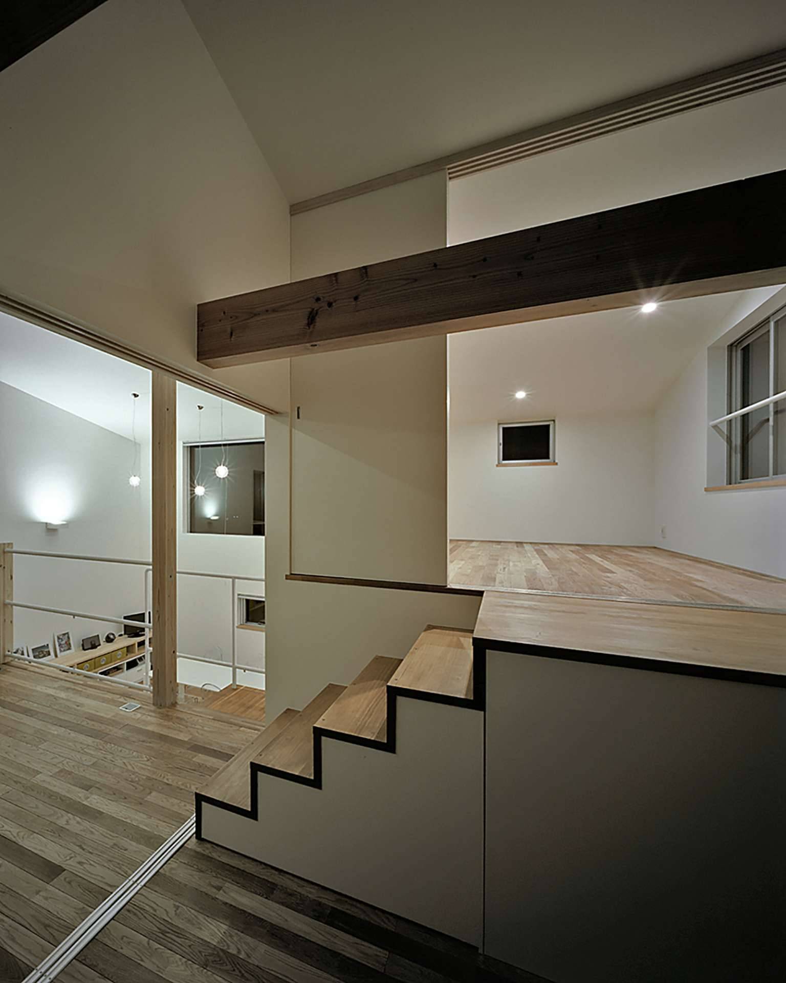 建築的には、7.2m×7.2mの正方形プランの中に地下はコンクリート打放しの落ち着いた穴蔵空間があり、1階~2.5階はレベル差1.5mのスキップフロアとしている。各領域が水平方向+垂直方向に連続して空間ボリュームが増幅されていく様要求諸室をまとめあげた。