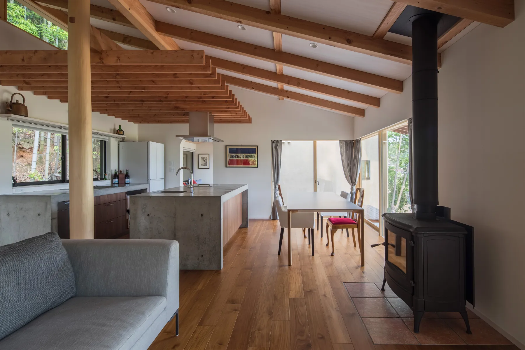 内部では、キッチンを現代版の「かまど」と読み替え、基礎と一体で立ち上げたコンクリートで作っているほか、主室の中央に立つ「大黒柱」が見る角度によっては「床柱」のようにも見えるように周囲を設え、構造としての役割だけでなく象徴的にも機能するように扱っています。また通常のプロセスとは逆に、既存の竹木をどこまで伐るかを建物の計画と並行して検討していくという引き算の外構計画を行っていますが、ひと冬をかけて毎日現場に通い、実際にこつこつと「引き算(=竹の伐採)」をしてくださった建主の住まいづくりに対する情熱には頭が下るばかりです。