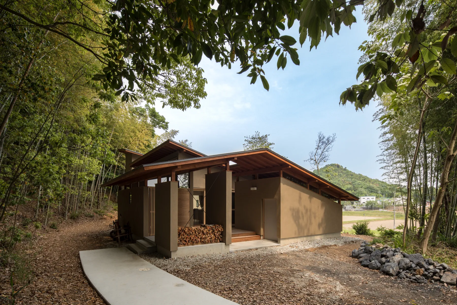 山間の小さな集落を見渡せる山裾の竹林を切り拓いて建てた住宅です。初めてこの地を訪れたときには、鬱蒼と生い茂った竹や雑草であたりは全体に薄暗く、どこが敷地境界なのかも判然としませんでしたが、何度も足を運ぶうちにこの場所の特性が読み取れるようになってきました。竹が揺れる気配から伝わる風の抜け方、少し高台になったこの場所だからこそ得られる眺望、背後に山があることの安心感。兼業で農業を営む住み手とそういった感覚を共有しながら、この場所に建つ現代の民家はどうあるべきかを考えました。