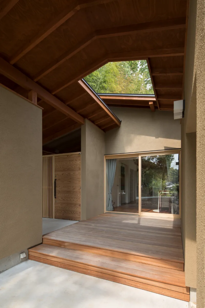 まず、いくら切ってもまたすぐに生えてくる竹、背後にそびえる雑木の里山という力強い自然に侵食されない伸びやかな生活の領域を確保するべく、全体をいくつかのボリュームに分け、それらの間に人工的な半屋外の空間を挟み込むことで、周囲の自然に対する緩衝地帯としました。ここには季節によって各種の苗のパレットが並び、農機具や軽トラックが出入りし、主暖房である薪ストーブの薪が積まれ、玉ねぎが吊るされることになるでしょう。
