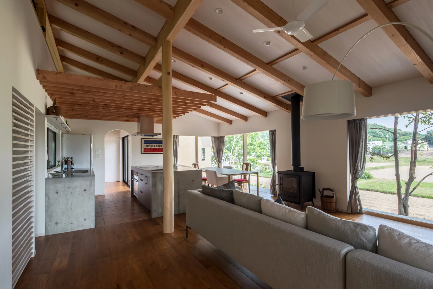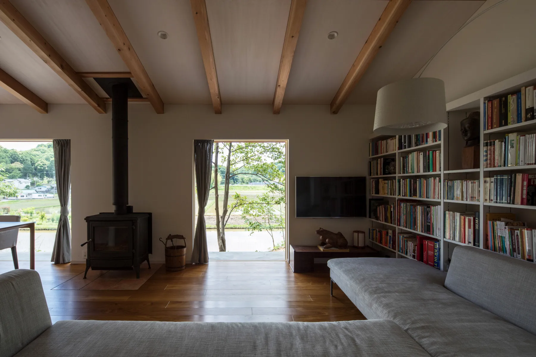敷地という小さな範囲に留まらず、周囲に広がる田んぼや里山まで含めた大きなランドスケープと、それらを受け止め生活の場を規定するルーフスケープ。その場所に相応しい両者の関係を見つけることができれば、自然と風景に馴染み、日々の暮らしの雑多なあれこれや将来にわたる住まい方の変化を受け止めうる、大らかな住まいをつくることができるのではないかと考えています。