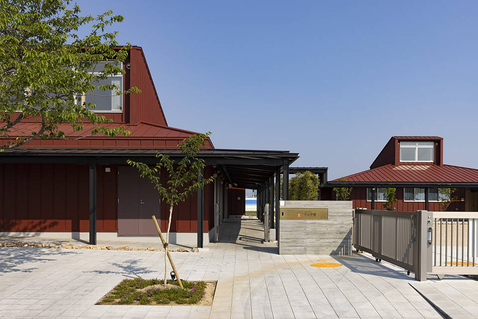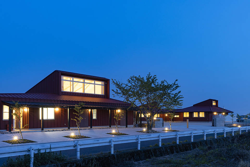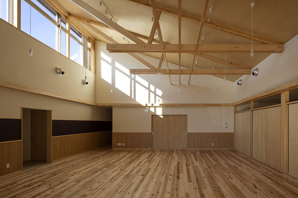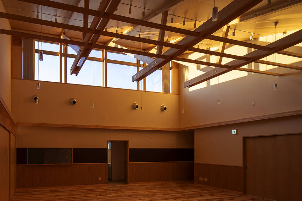 木造3方向片持ち梁による、柱の無い開放的なエントランスス...
