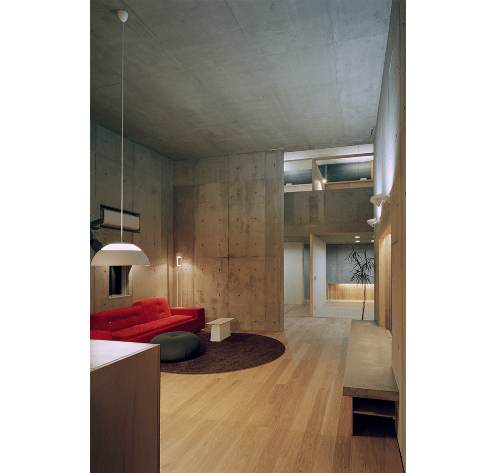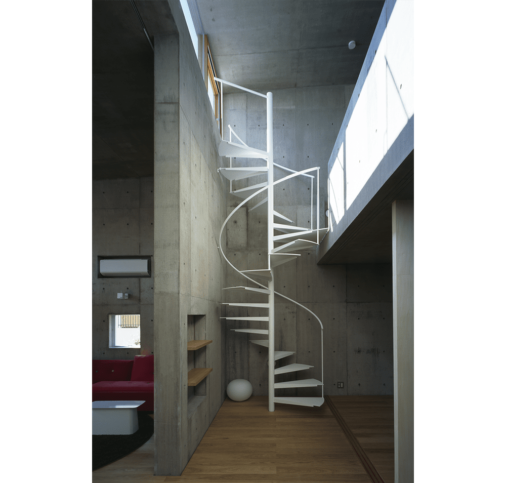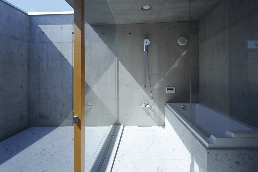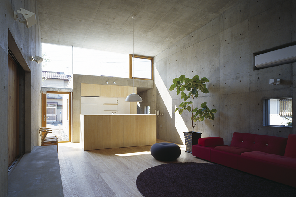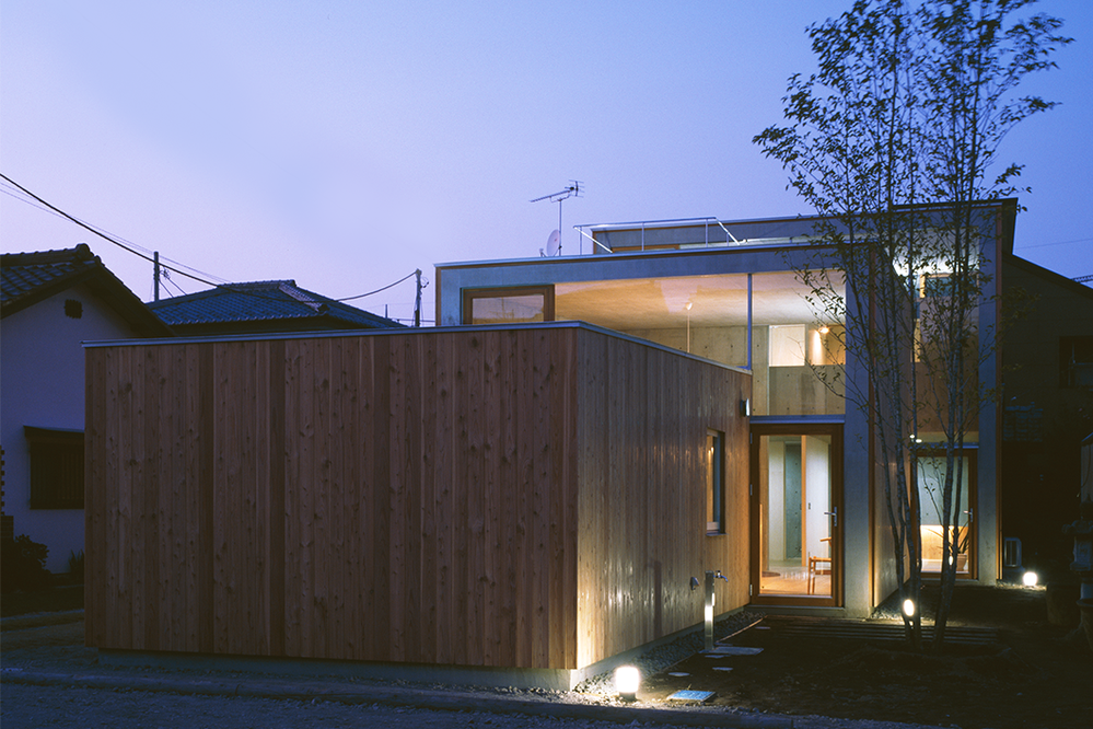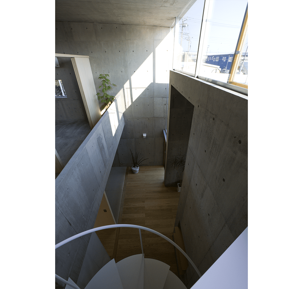 大中小のコンクリートの箱を南側に小さい箱が来るように南北に並列し、その箱のずれた隙間をL字型の邂逅としている。大箱は個室が2層、中箱は天井の高い居間、小箱はバスコートのある開放的な浴室となっている。敷地の半分を畑用地として残し、この畑への日当たりと南北に並んだ室内各所への陽当たりを確保するようにした結果、生み出された形である。東側道路の騒音や西側の視線に対しては閉ざしつつも、室内には光と風が通り抜け、外観の閉じた印象とは対照的に内部は外に開放的な空間となっている。