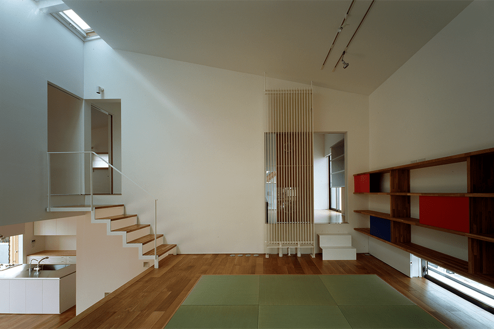 訪問者を招く、イベントを催す、食事を楽しむといったフォーマルな居間と、映画鑑賞、子供の遊び場、ピアノを弾くといったインフォーマルな居間を大きな階段でつなげた住宅。この性格の異なる2つの居間は、多彩な生活スタイルに応える。