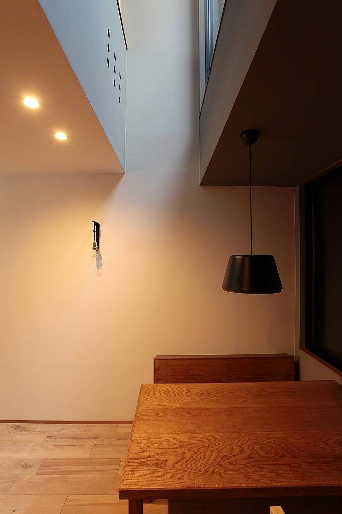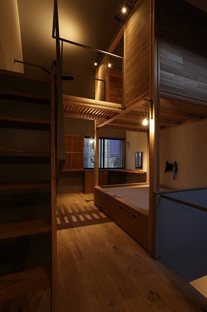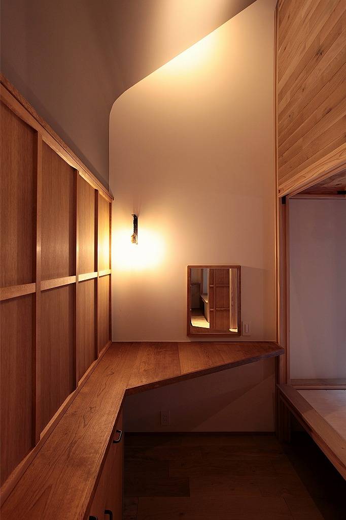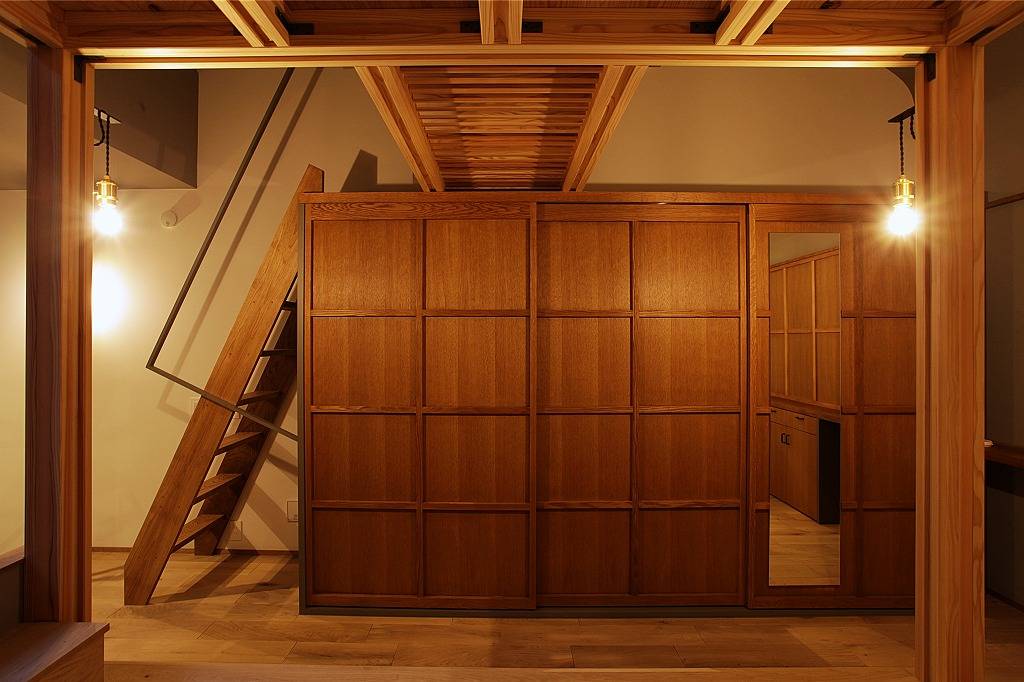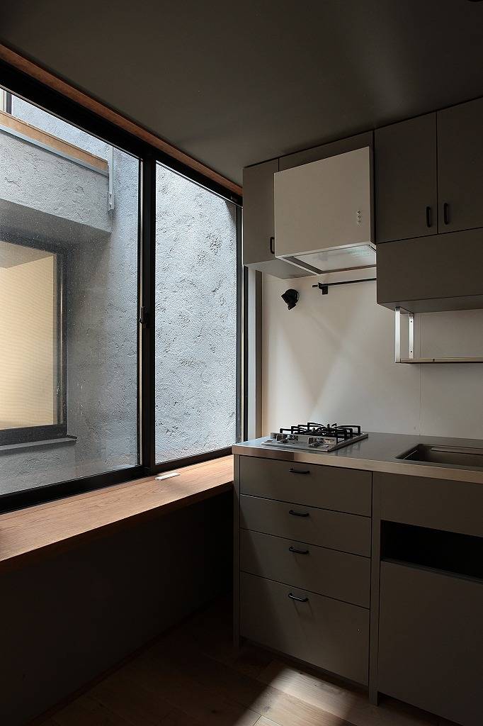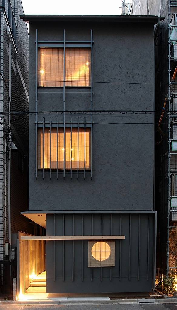 まちなかの狭小地建つ小さな店舗兼用住宅です。外観は左官と板金で仕上げ、プライバシーを守りながらも外部からの採光を確保するために窓の外側には格子を、内側には板戸を施しました。また夏の厳しい朝日から室内環境を守るために江戸伝統工芸師による簾(すだれ)を採用、街並みにも優しい情緒を与えることが出来ました。