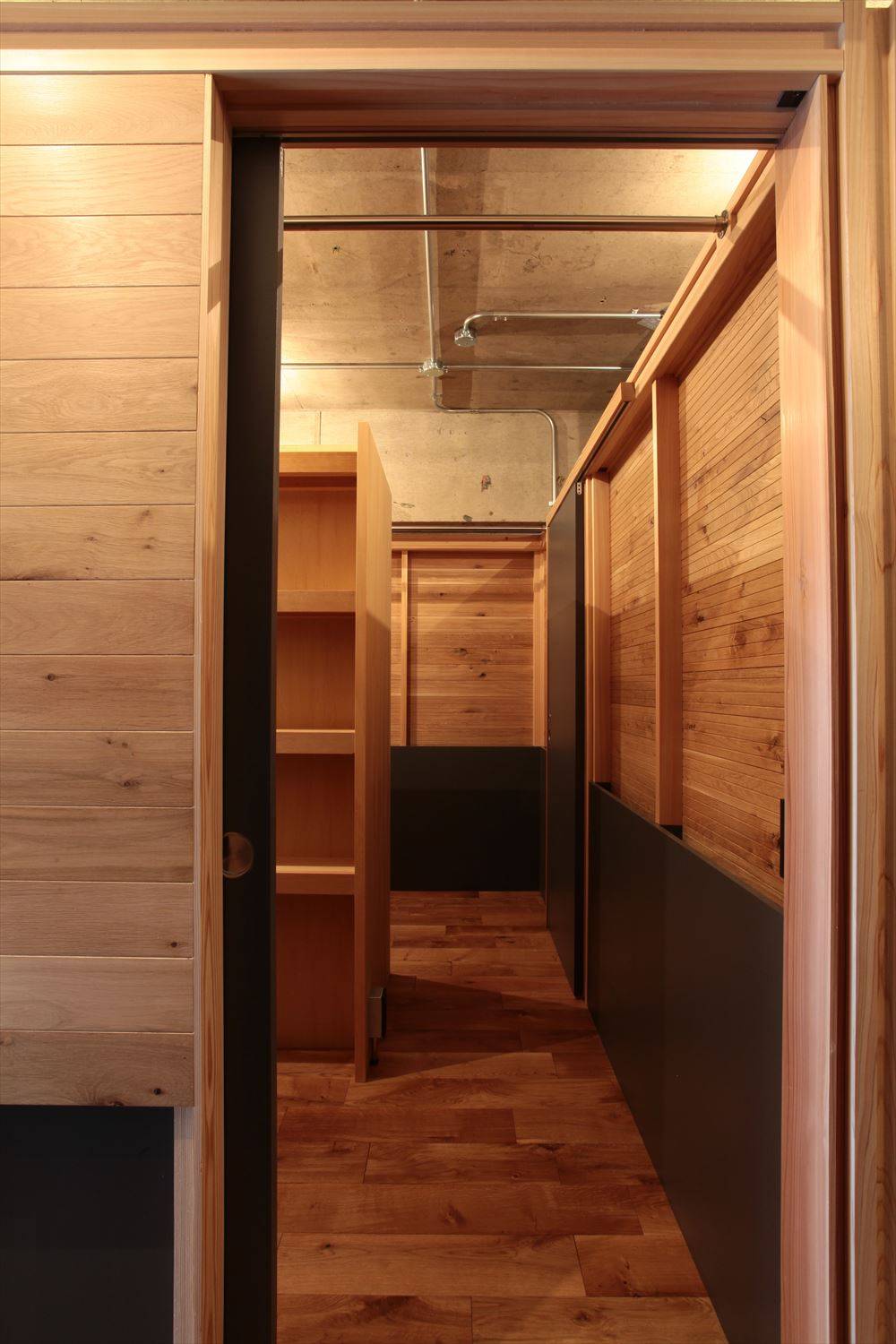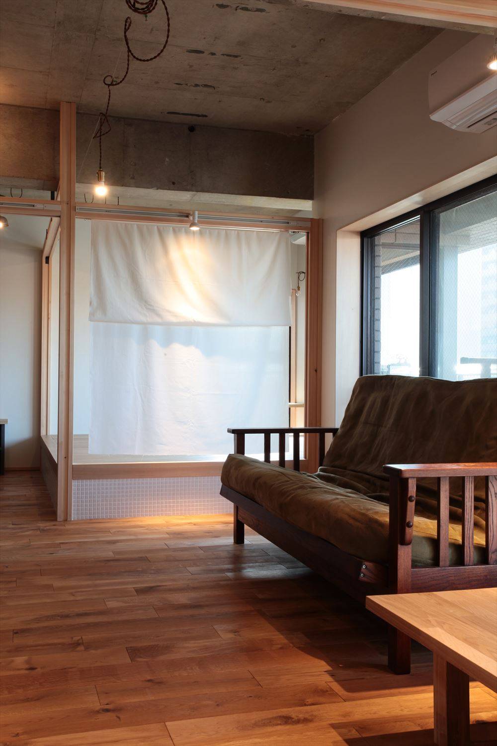 当社が特許を持つマンションリノベ材KIWAKUを使ってのリノベーションです。部屋の中心にKURA(ウオークインクローゼット)を置き、その廻りに居室を配置しました。KIWAKUは将来のニーズに間取りを自在に変更出来る新しいリノベシステムです。