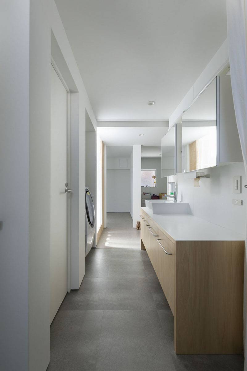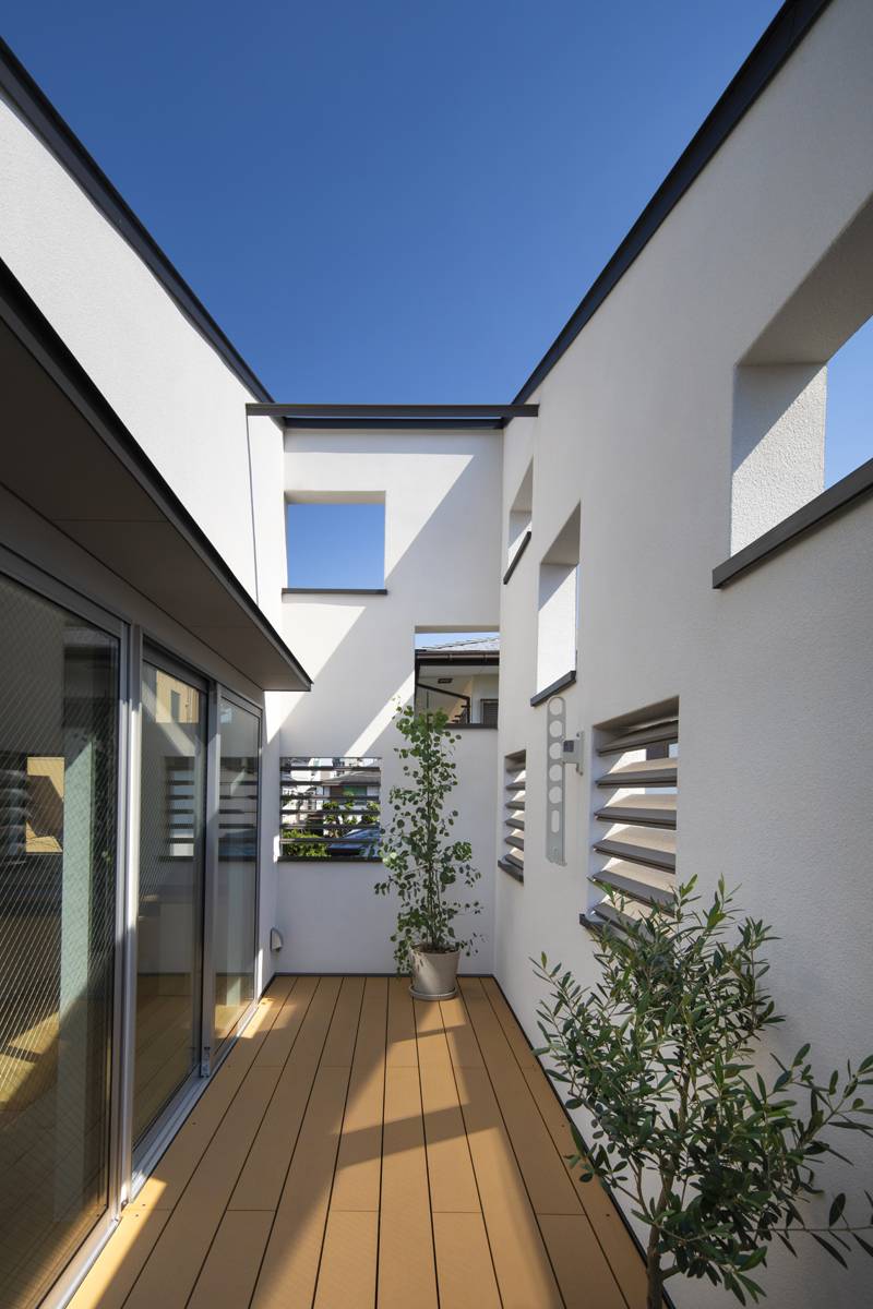 本計画は品川区の住宅地、路地つきあたりの四方を隣地に囲まれた21坪の敷地に建つ夫婦と子どもひとりの家族3人のための小さな住宅です。ご家族からの要望は「外からのプライバシーは守りながらも、明るく伸びやかに暮らしたい」という「閉」と「開」が共存した住まいでの暮らしでした。