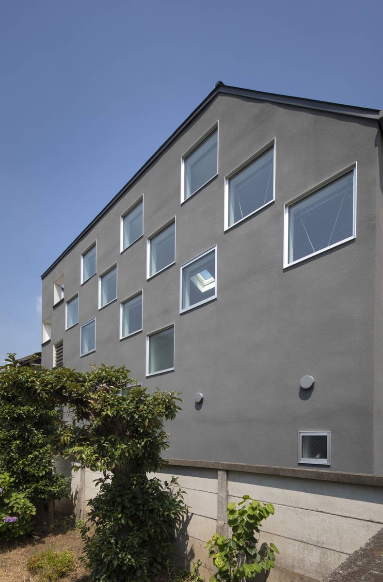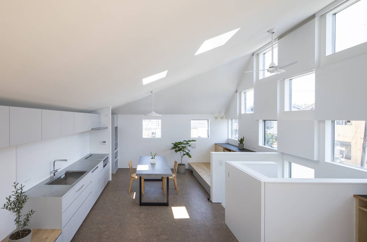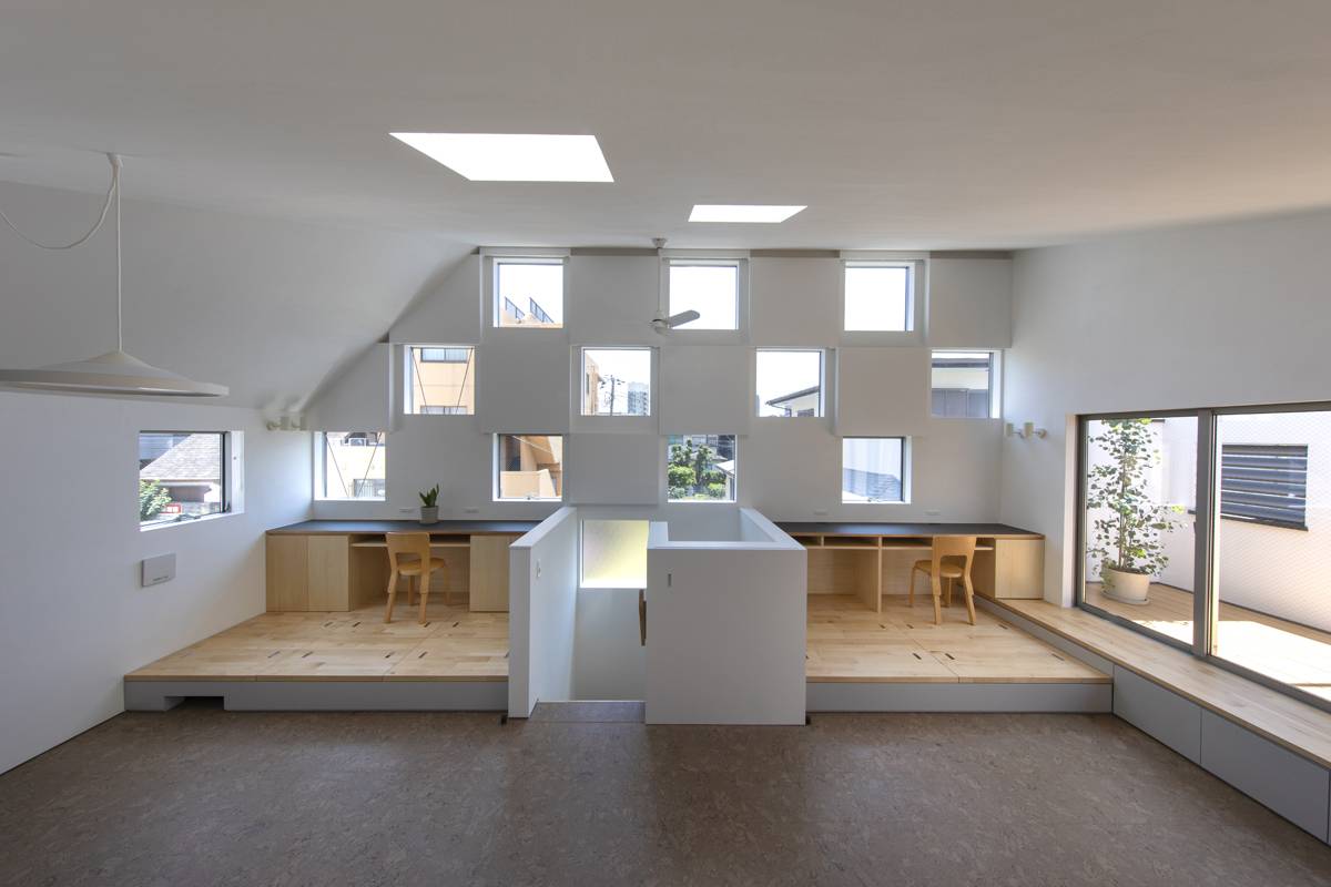 2階のLDKワンルームは南へ伸びやかに広がる勾配天井とし、空と空地へ繋がります。窓開口には内外双方からのプライバシーを考慮し、大きなものを用いずに小さなものを市松に配しました。