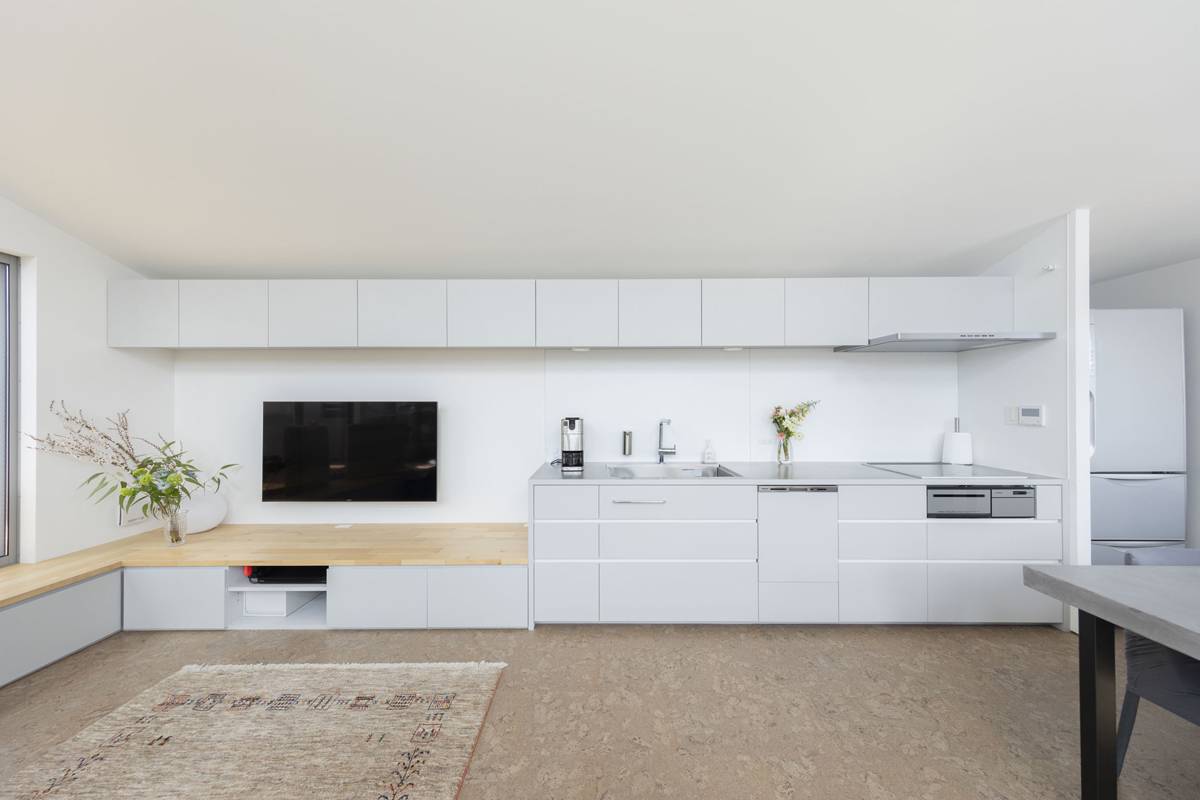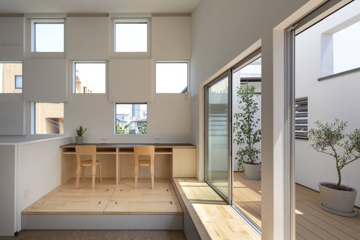 21坪という限られた敷地に建ぺい率60%、容積率100%という条件のもと、隣家の建ち方や空地の在り方、眺望の抜けなどを考察し、家族が集うLDK は2階の床すべてを使ったワンルーム、それ以外の暮らしを支える諸室は1階に配しました。