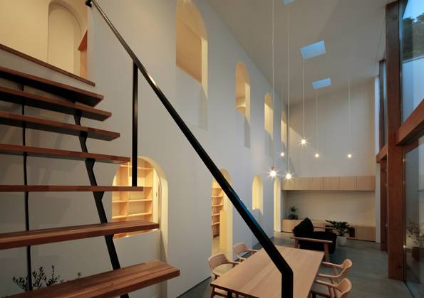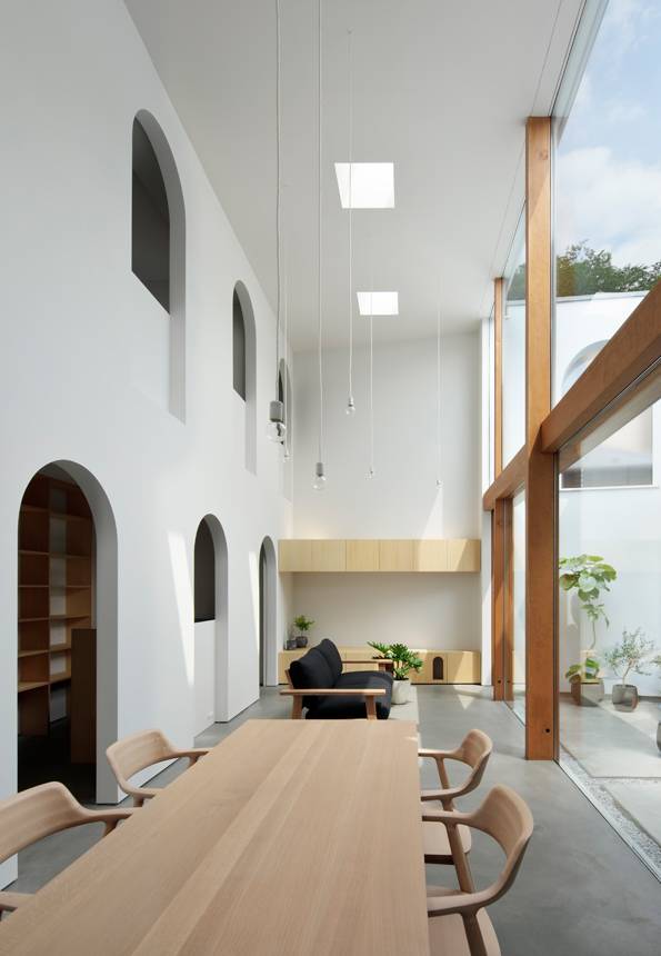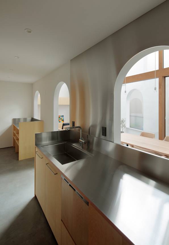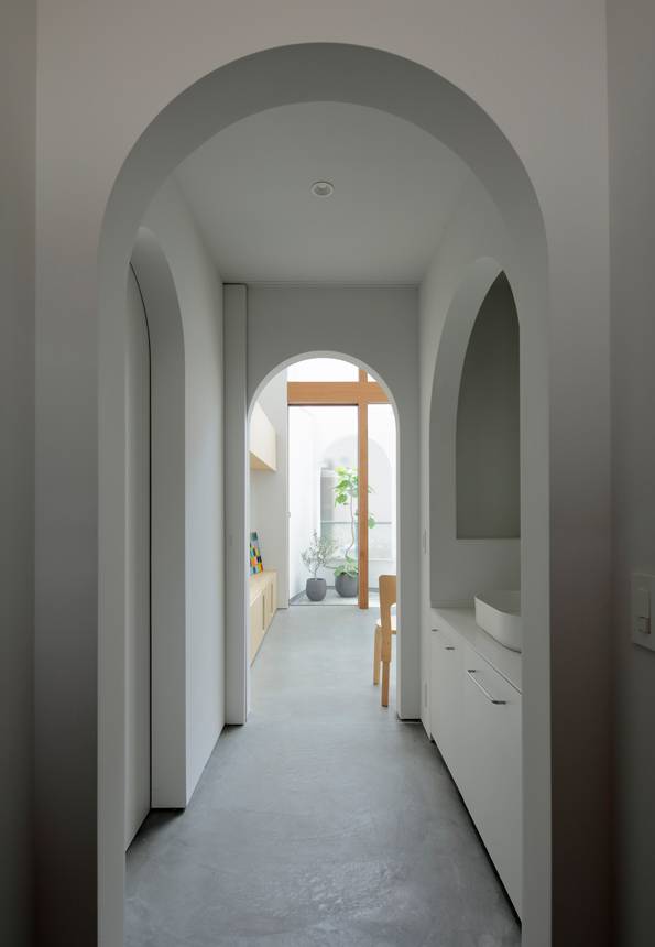 開口は窓や扉、枠ともに方形ではなく、日常風景や流通規格からずれたアーチ形とした。古くからかまくらや洞窟などでみられるアーチ形は内と外をあいまいにつなぐ開口として機能する。アーチ開口を内外各所につらならすことにより、内や外、奥庭と1つとなったLD、各室の境界をあいまいにし、街なかにいるような豊かで多様な光や風、人、視線、雰囲気の流れ、広がりをつくり出す。