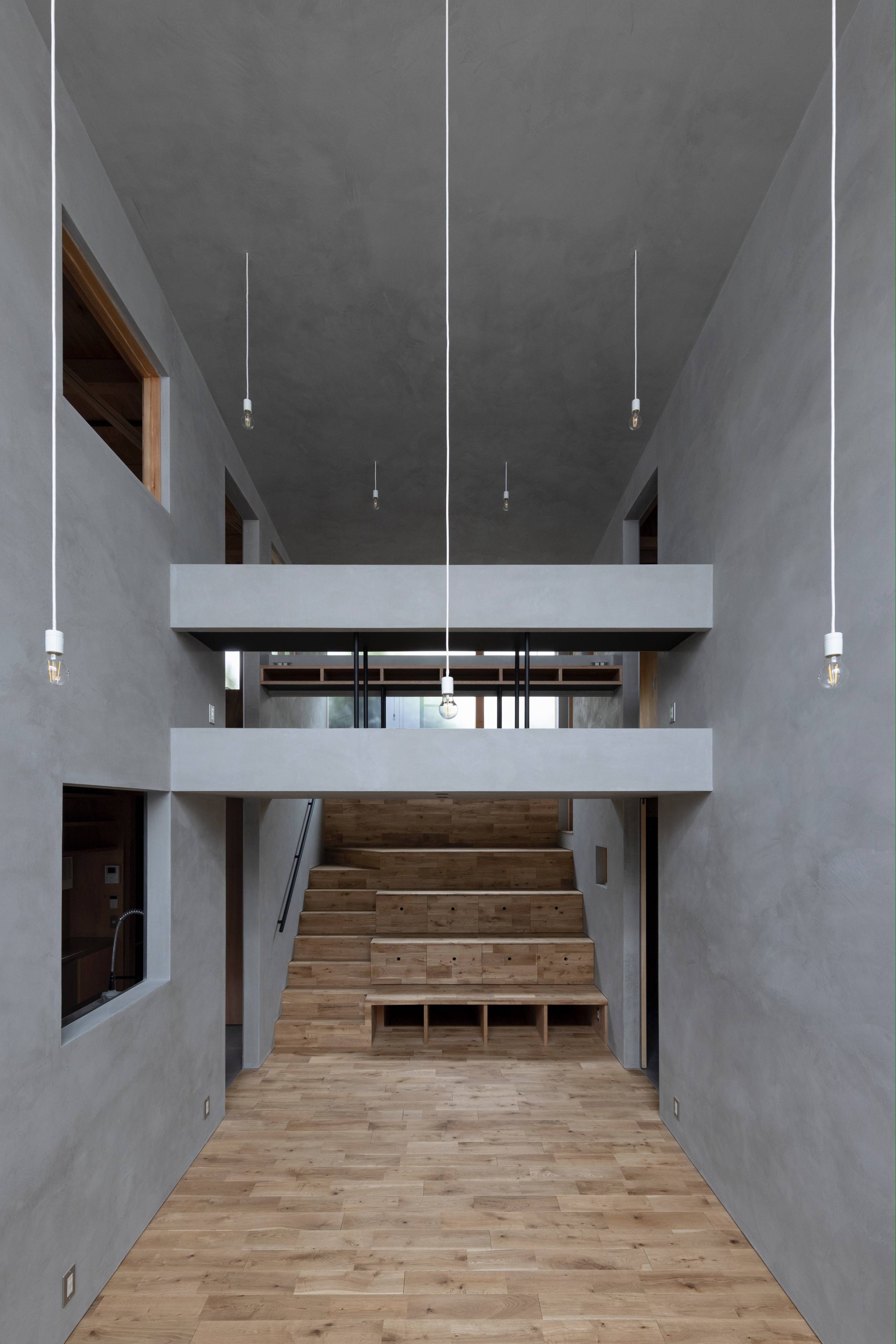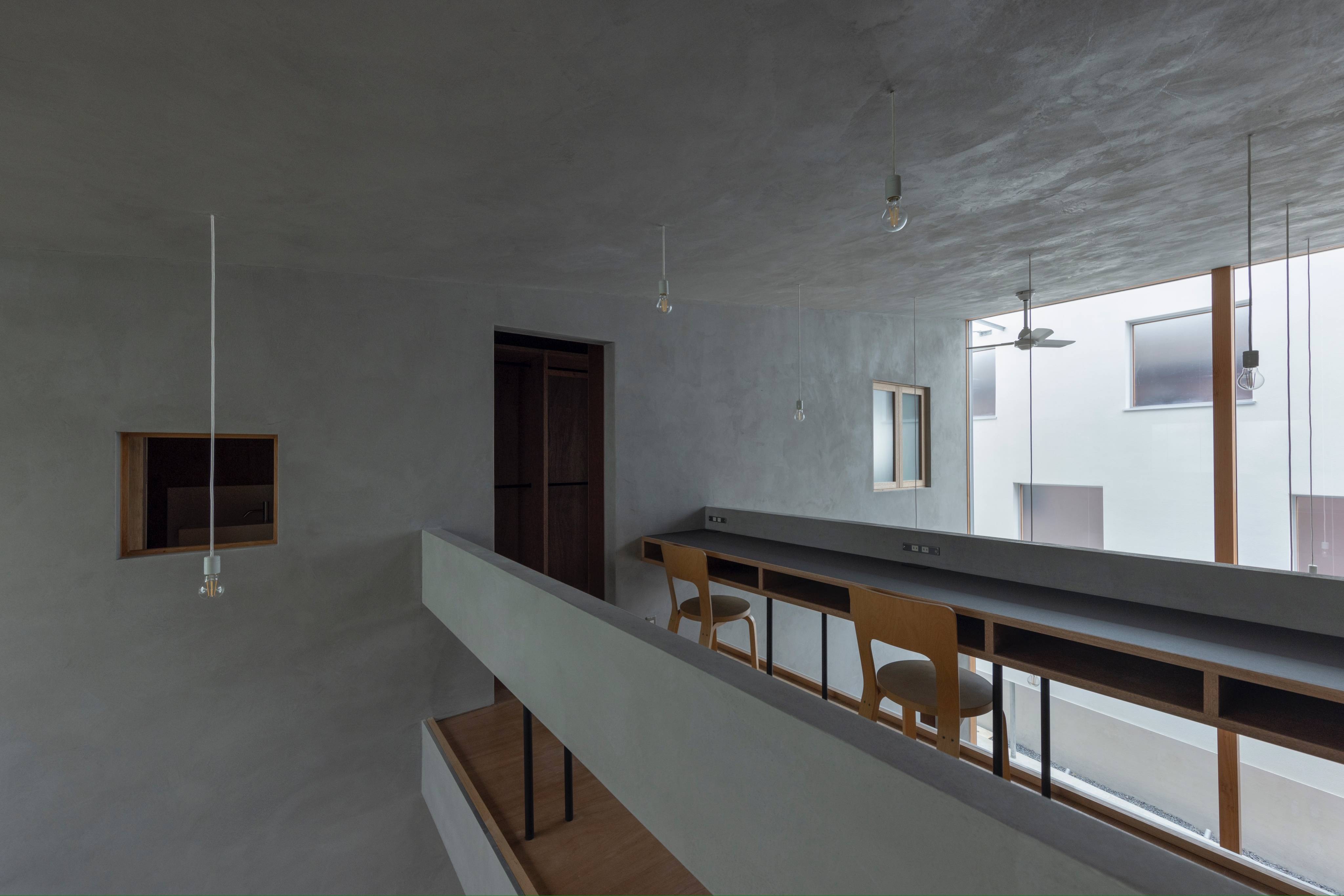 外スリットは明度が高く、明るさを届ける白色で内壁のように仕上げ、内スリットは明度を抑え、安らぎを与える灰色で外壁のように仕上げた。そして、その内外のスリットを屋根まで吹き抜けた大きな開口がつなぐことで、視覚作用による外の内部化、内の外部化を図った。外の内部化は安心と広がりを、内の外部化は街路のような空間性をつくる。
