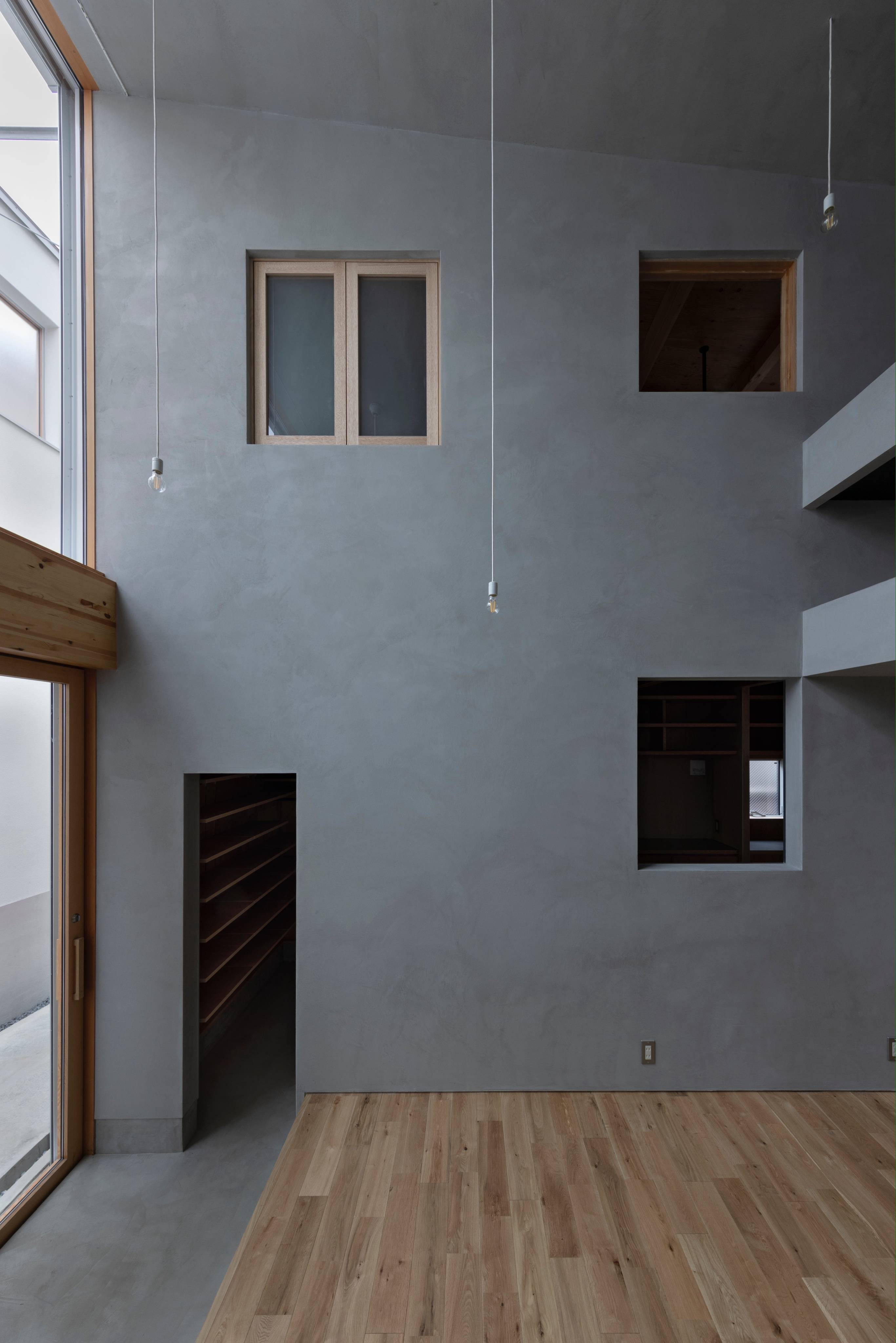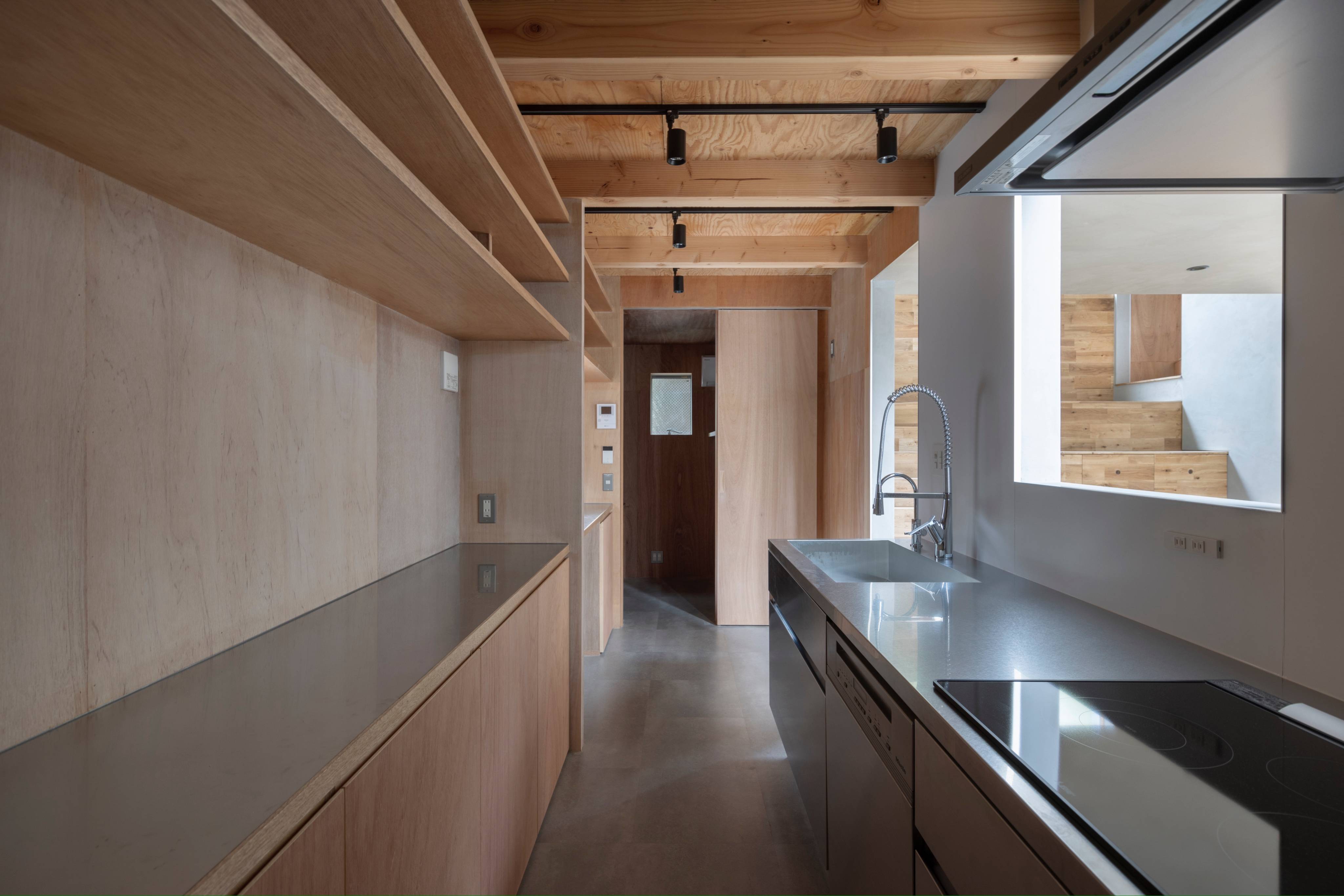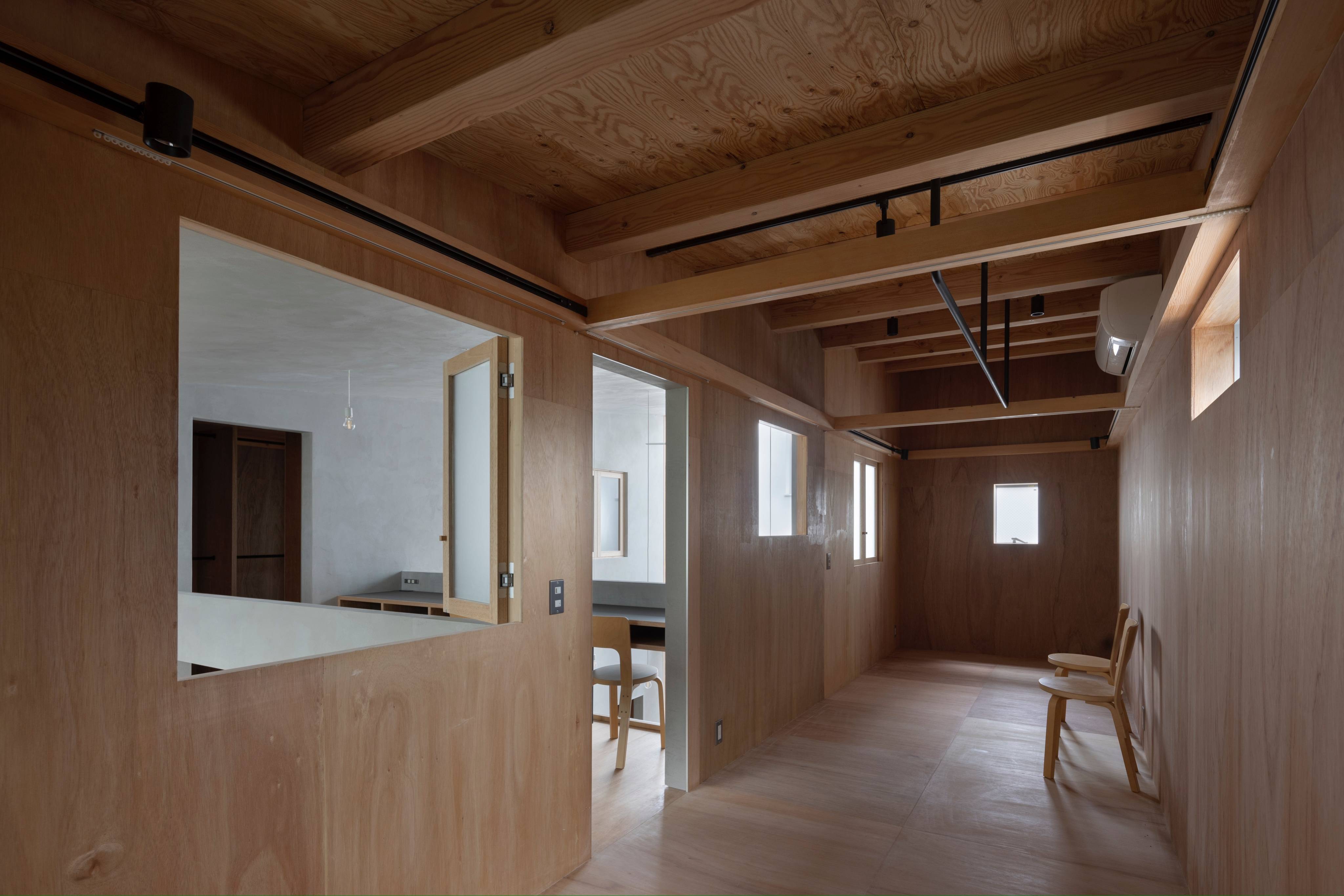 台所や寝室、納戸など用途が決まった諸室は、必要最小限の大きさとし、2層吹き抜けた内スリットの両側に接するように計画した。スリットに設けた開口が、光や風、家族の気配や雰囲気、視線を各所へ伝え、空間に広がりを与える。また、諸室の内装は構造材や合板の現しとし、間取りの更新や造作家具の追加、仕上げの変更など、将来の家族の成長に合わせ、対応できるように余白のあるものとした。