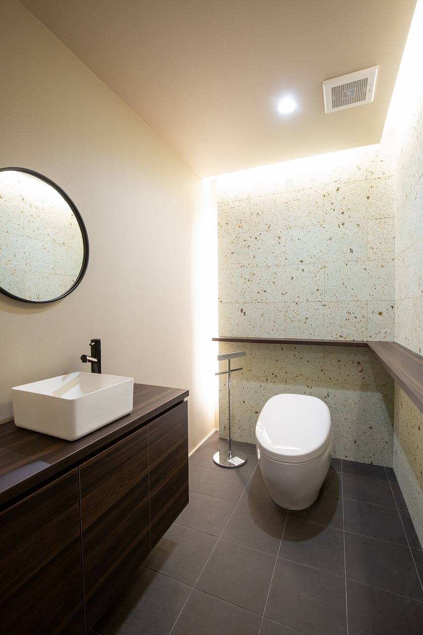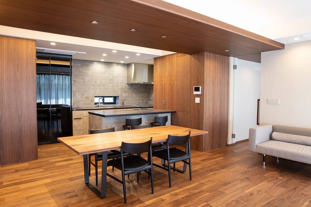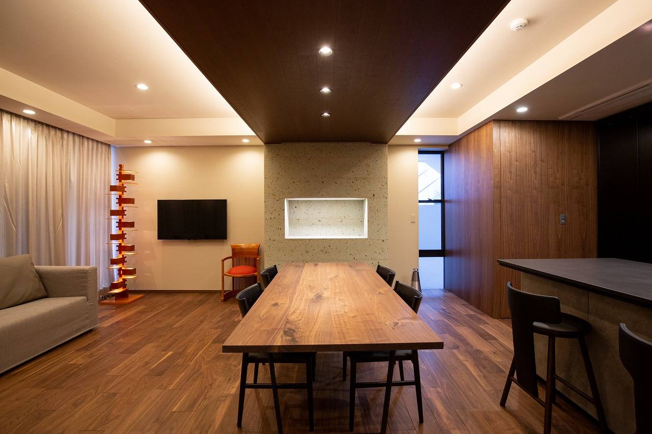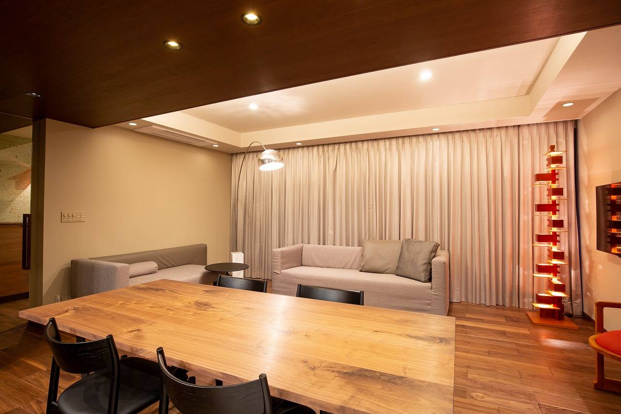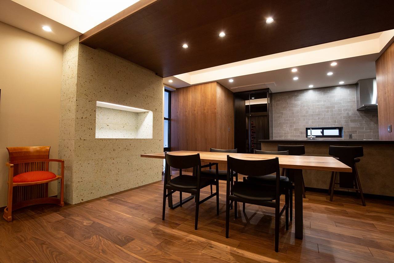 都内 RC造戸建て住宅の大改修です。もともと有名家具のコレクターであった先代のコレクションを最大限に生かしたリノベーションプロジェクト。子育て真っ最中でありながら、いつでもこだわりの空間で生活されたいというクライアントさんご家族のご意向を踏まえて設計しました。モダンではあるものの、とても落ち着いた空間に仕上がりました。 ウォールナット、大谷石のコンビネーション。 お食事 お酒が大好きなクライアントさんが 楽しくゆったりとくつろげる空間を目指しました。