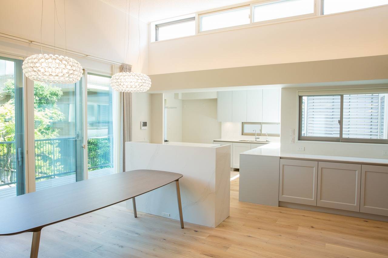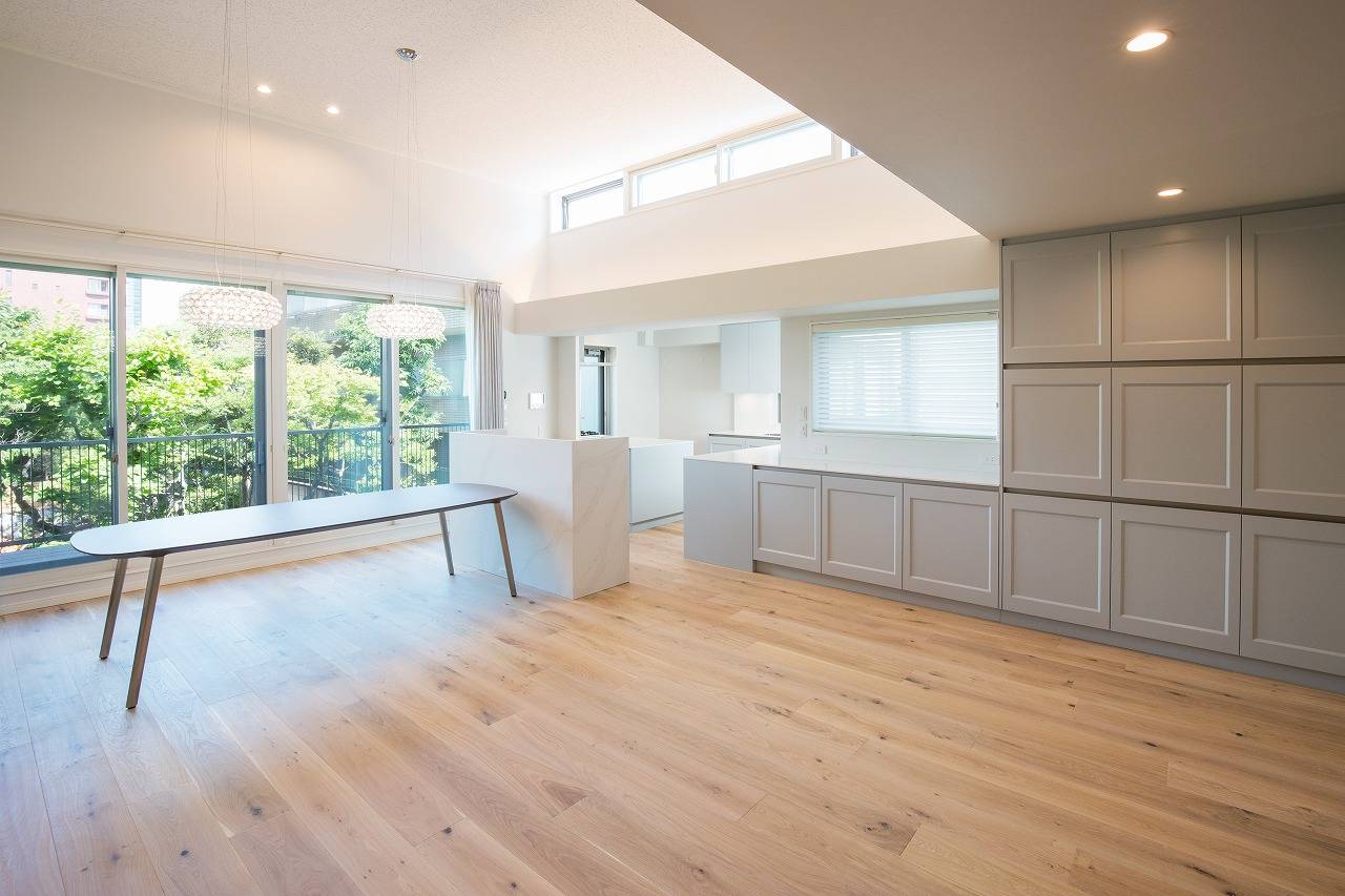 1.5層の高さを誇るリビング空間は、お庭から注がれる気持ちの良い光であふれ、お庭に広がる樹木を通して流れる風も都心とは思えない心地よさです。
