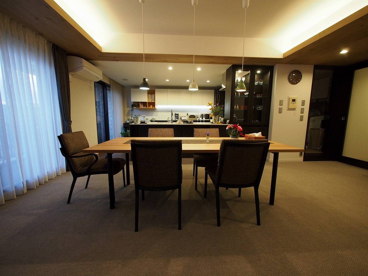 2 フローリングにできない代わりに、梁型部分の天井に木を貼って落ち着く空間に 建具はダークブラウンでぐっと引き締める