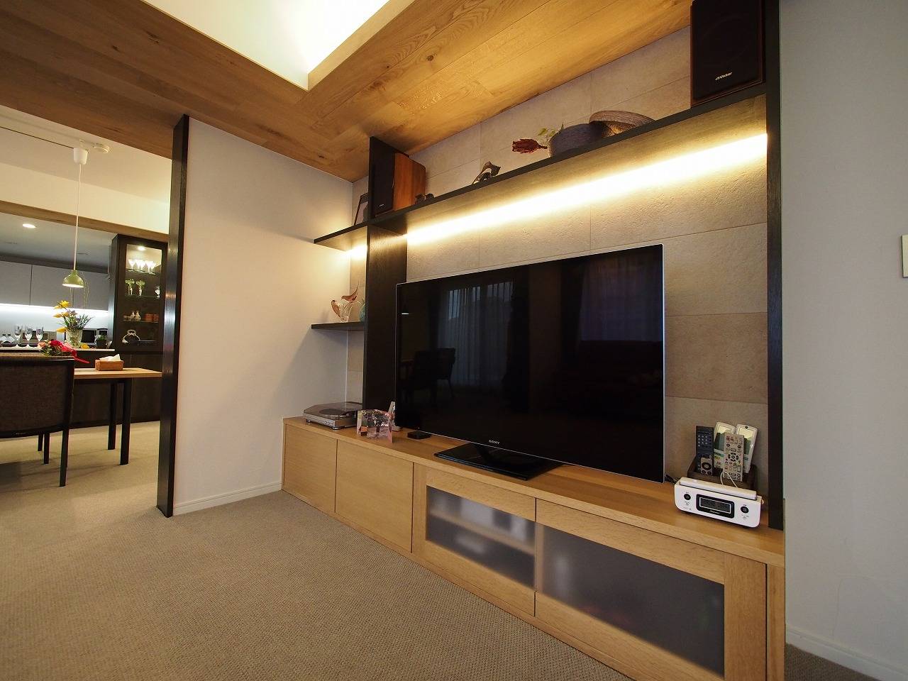 お料理上手な奥様には格別なキッチン空間を、JAZZや映画に明るいご主人にはくつろぎリビング空間を ご提案させていただきました。