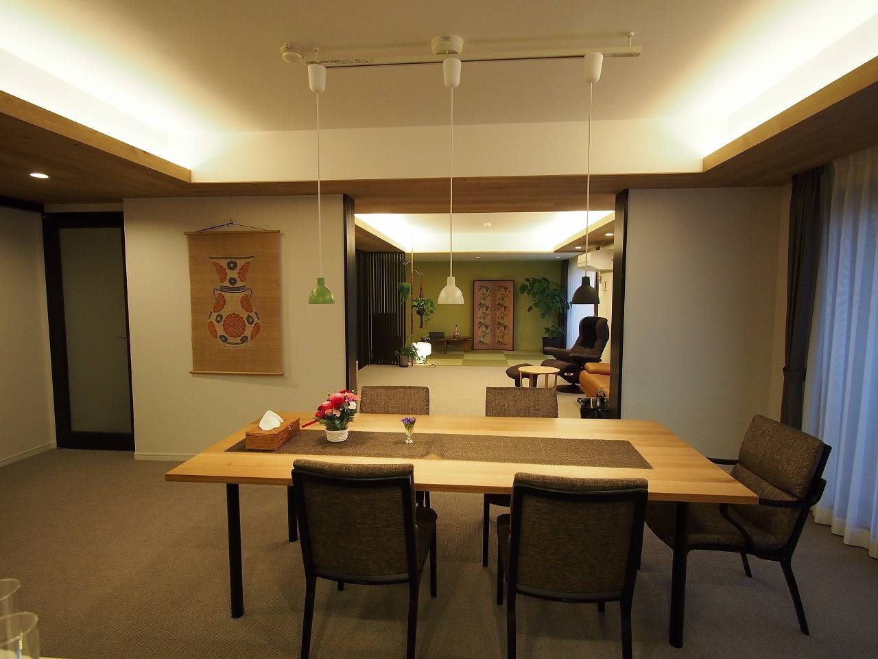 3 3間続きの部屋を少しでも開放的にするため、ビフォーではドアがあったものをすべて取り払い、和室、リビング、ダイニングキッチン と 奥行のある空間に仕立てる