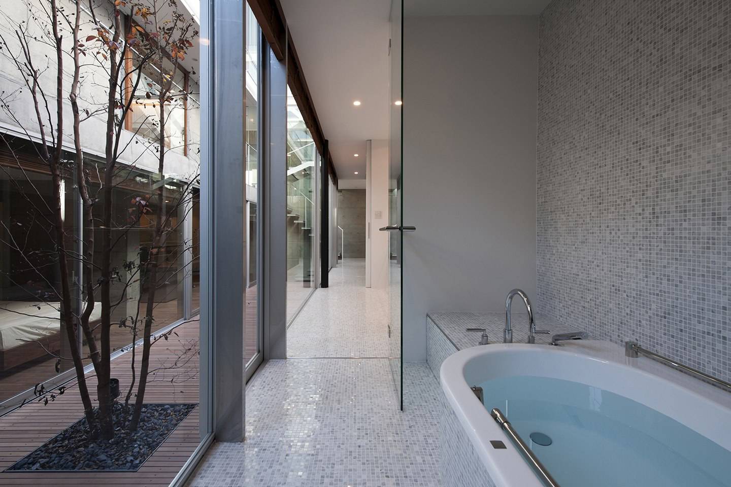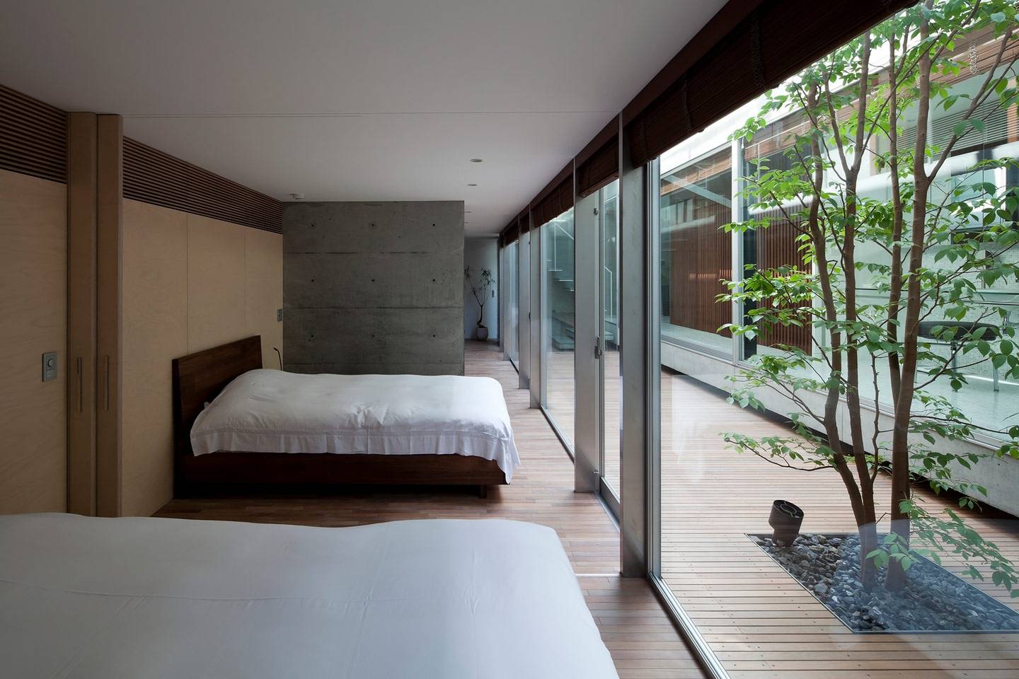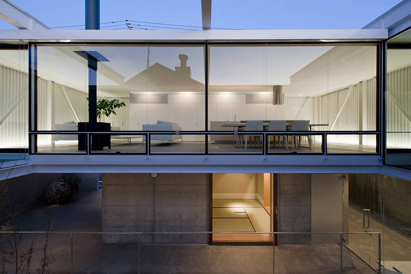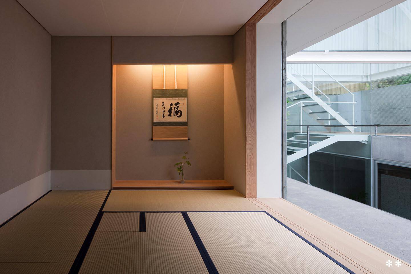 これらの空間に対し、1階は外界とのつながりの強い空間として扱い、ここに和室を置き、お茶会もできるよう設えた。2階を浮かすことで、その下の和室回りに生まれた中庭を中心とする流動的な空間は、茶庭に例えれば露地となり、和室は露地に置かれた茶室となる。この三つの中庭は一体となって一つのPatioとなる。
