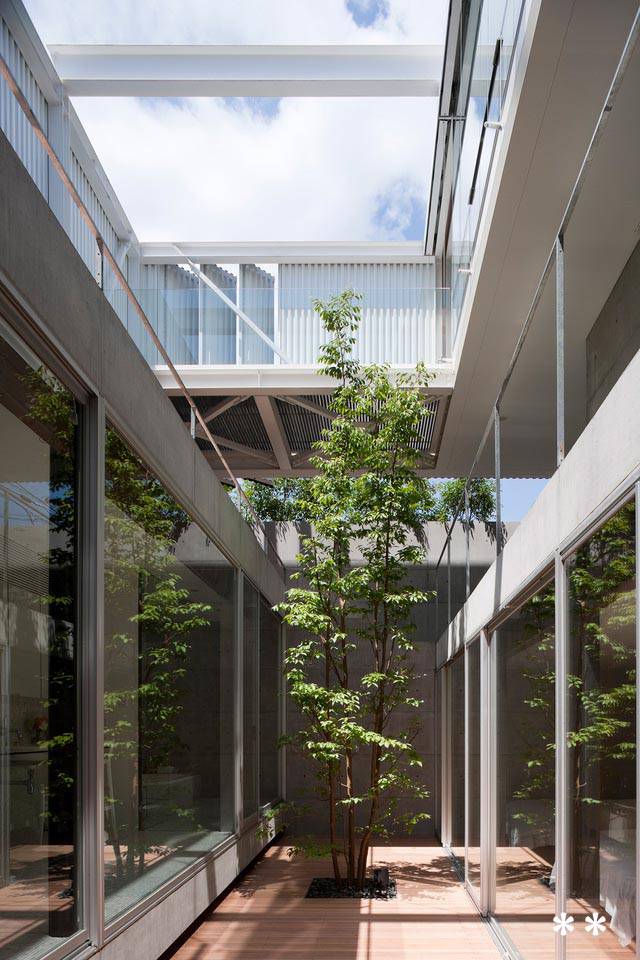 ここに2階下の水平なスリットからさわやかな風が流れ入り、通常閉鎖的になりがちな中庭が、プライバシーを保ちながら、風通しの良い快適な空間として結実した。中庭型都市住宅の新たな可能性が提案出来たと感じている。
