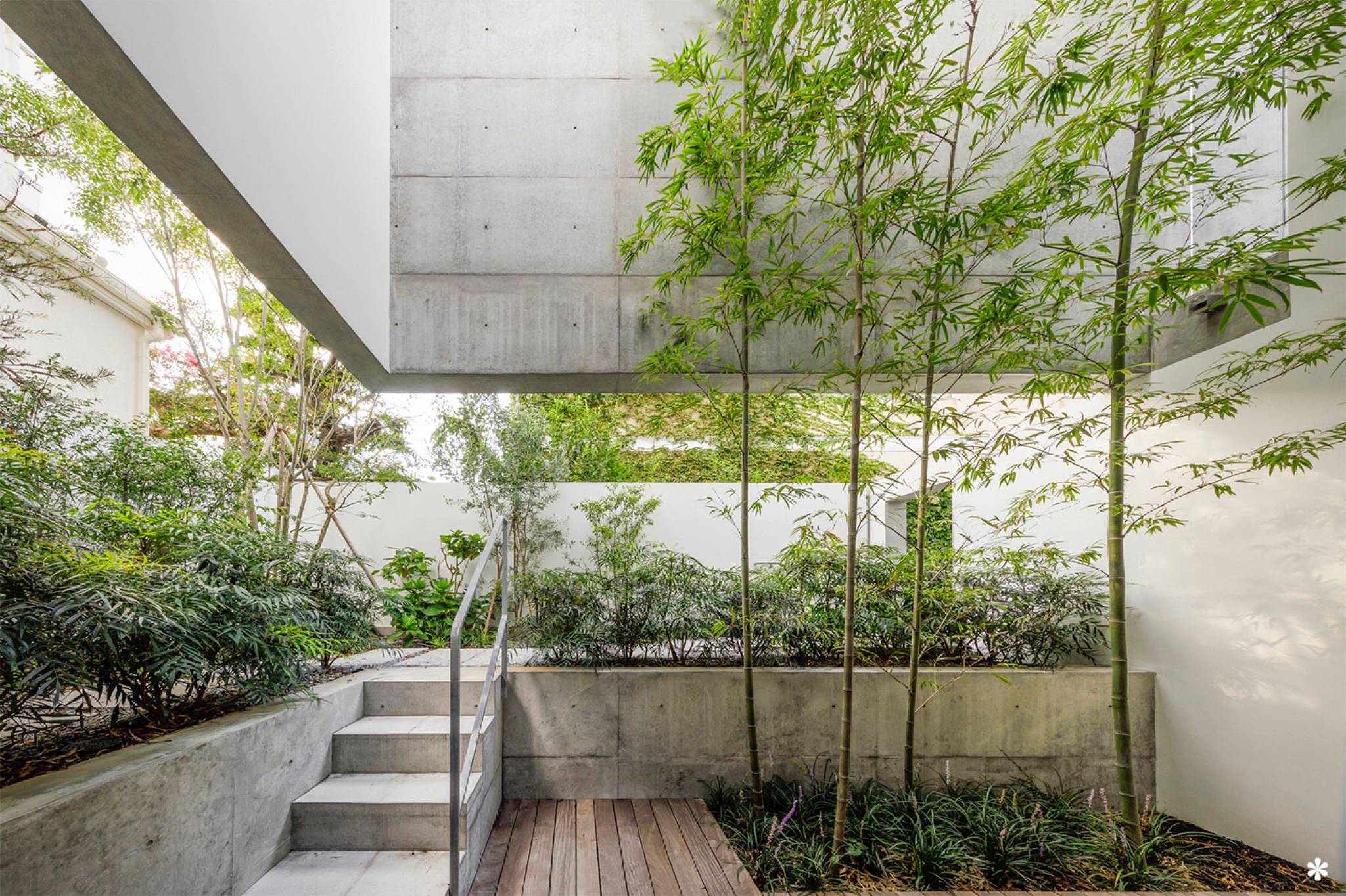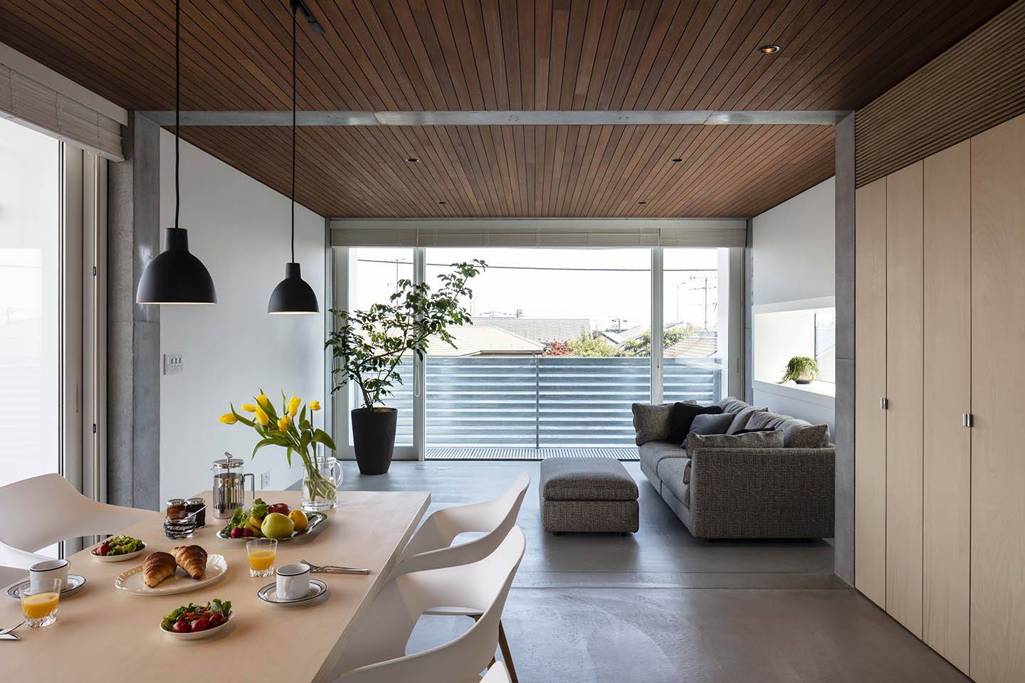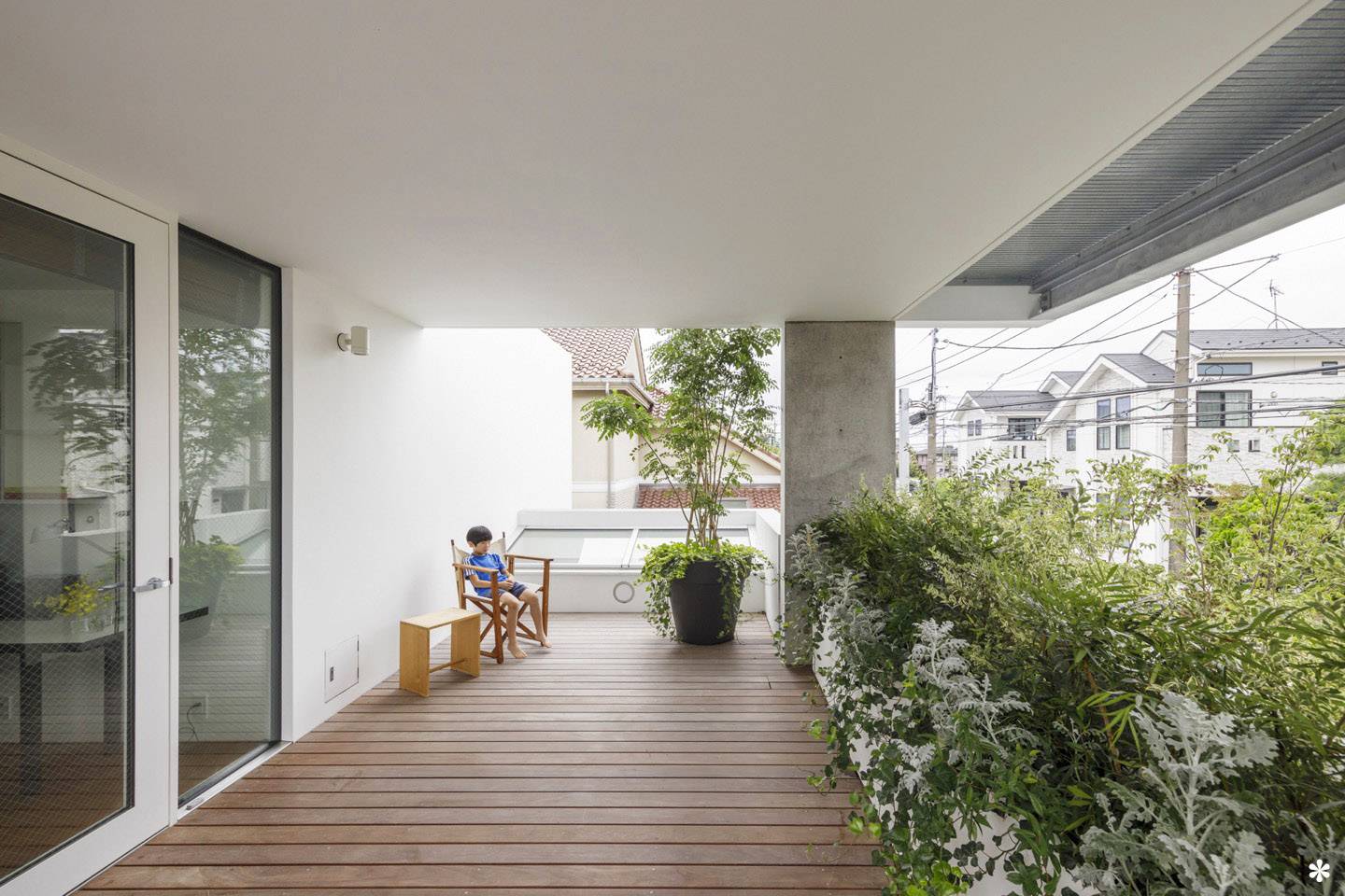1階仏間には、反射した光がハイサイドライトから室内を明るく満たしてくれる。2階西側では、寝室と浴室の目隠しになると共に、1階ではこの飛梁により上方への視界は遮られ、敷地境界に設けた塀との間にもうひとつの領域をつくり出した。1階の寝室から眺めると、飛梁の下では、空間は塀まで広がり、さらに隣の家の庭まで広がっていく。次々と生まれる空間の連鎖がこの建築の特徴であり「IN BETWEEN」と名付けた所以である。