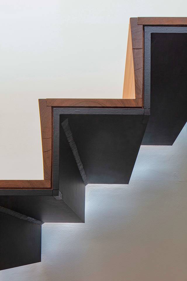 この条件で十分な光を取り込むための工夫として、反射壁(飛梁)を2階北側に浮くように設け、隣家からの目隠しも兼ねた。これにより1階と2階に別の領域が生まれ、それぞれの家の玄関の構えとなった。