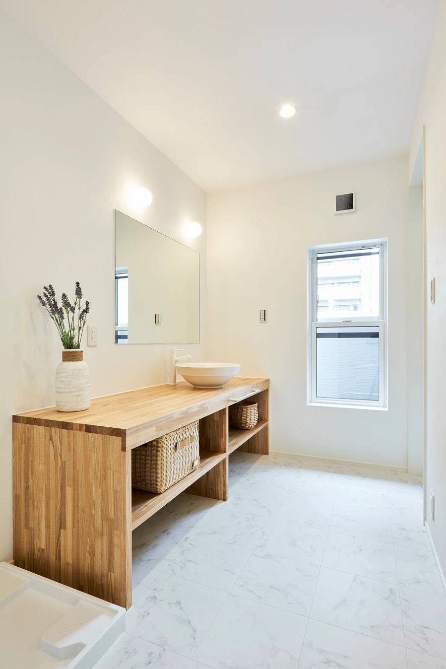 洗面室はタモ集成材という木を使い造作で作っています。