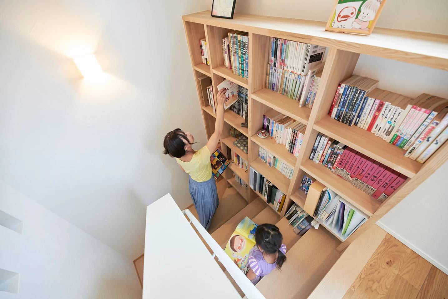 2階にのぼる階段室には本棚を作りました。家族で読んでいる本を共有したり、お子様が自然と本を手に取る