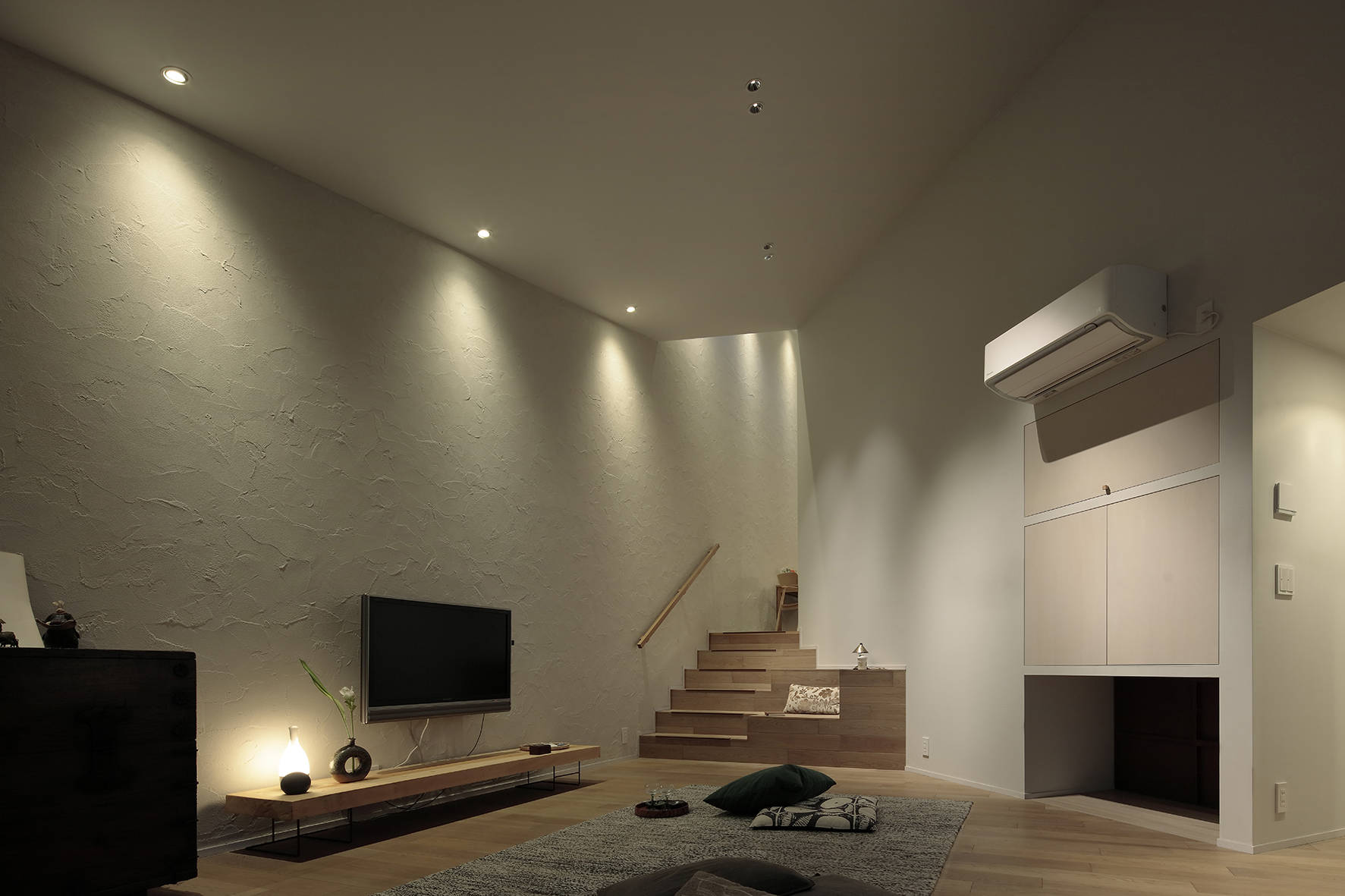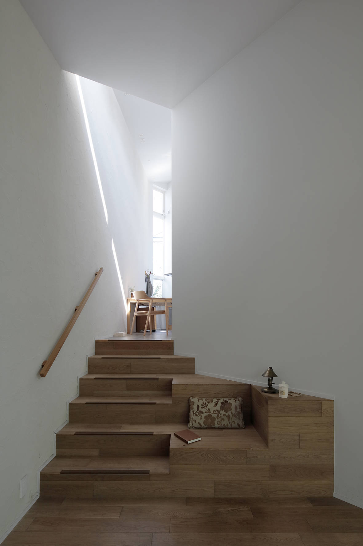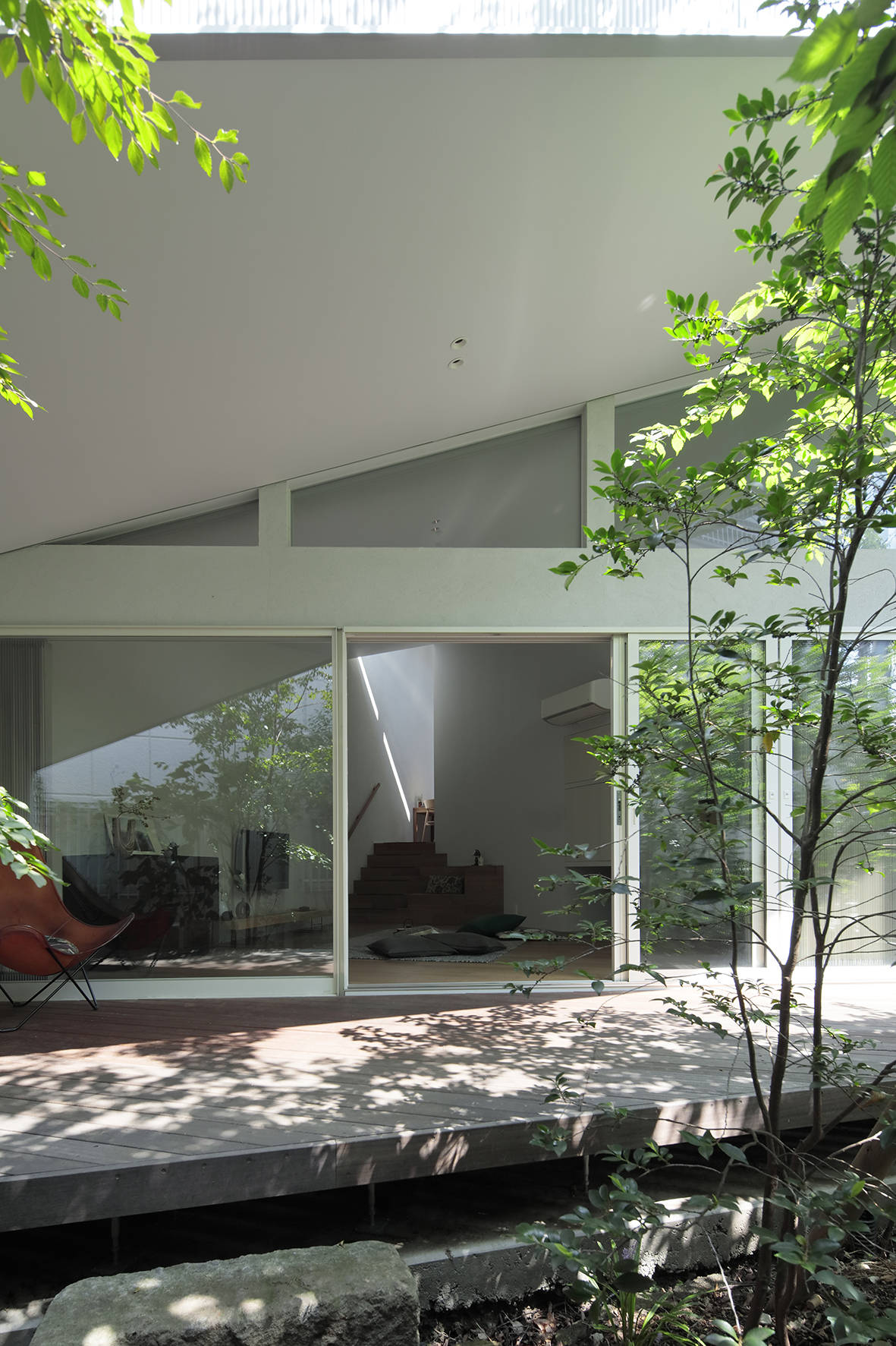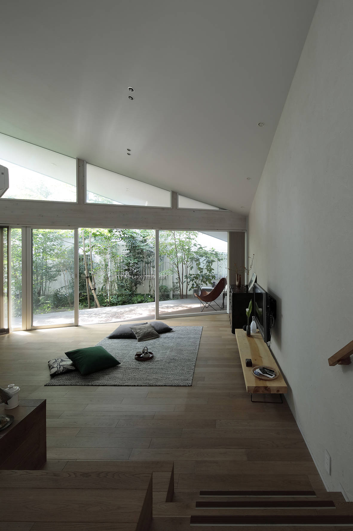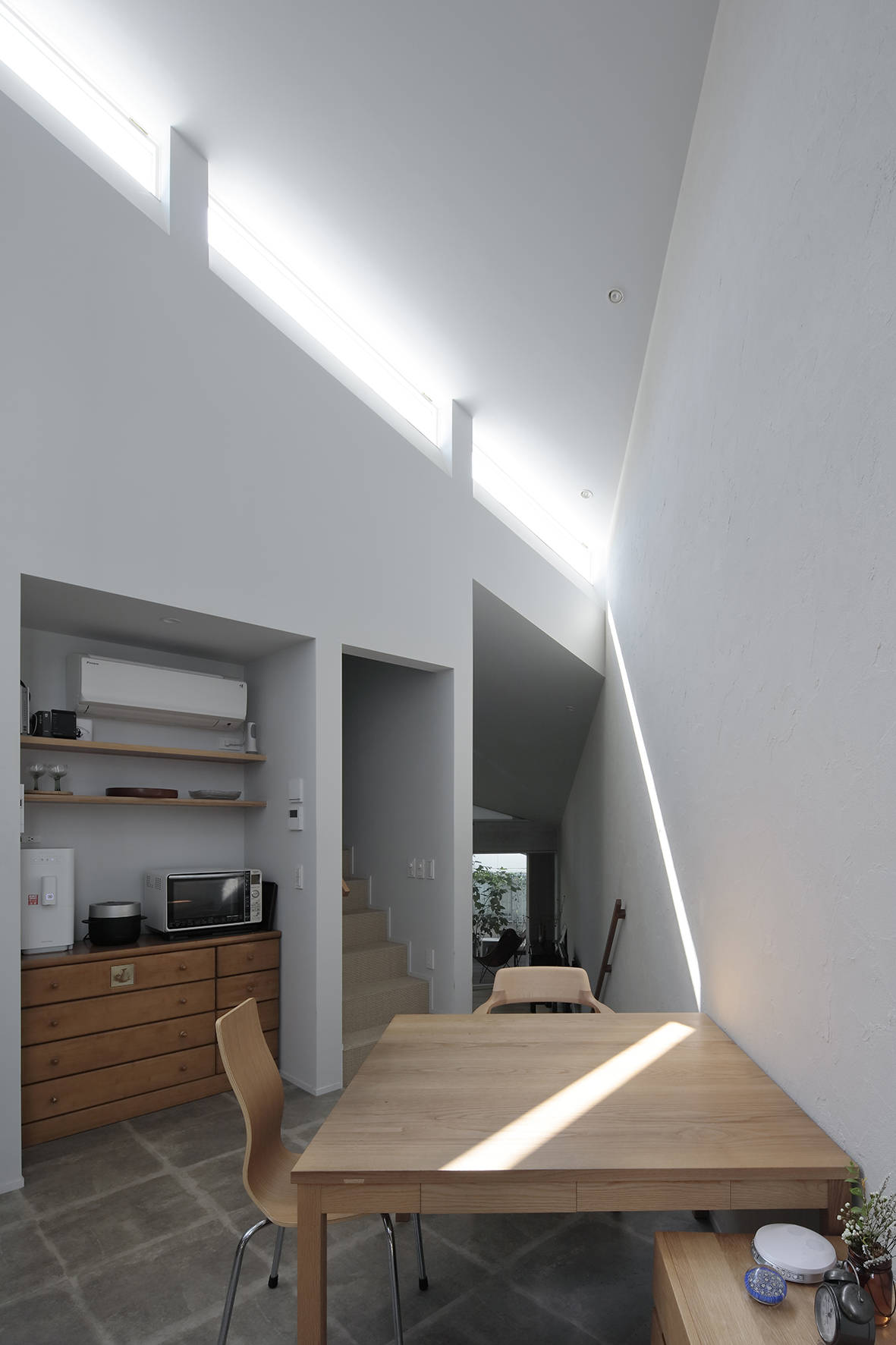 リビングからは隣接した庭を楽しみながらの生活する事ができます。リビングは庭から段々と奥に行くに従い狭くなっていく三角形の形をしていますが「ソファを置くとこの場所に座りなさいと家具に指示されているようで嫌で、猫のように居心地の良い時に自由に場所を選びたい」というクライアントさんの意見で四角い形状でなくても良いしソファも置きませんでした。リビングから半階上がるダイニングキッチンを見るとチラッと光の帯が見えるように設計しています。