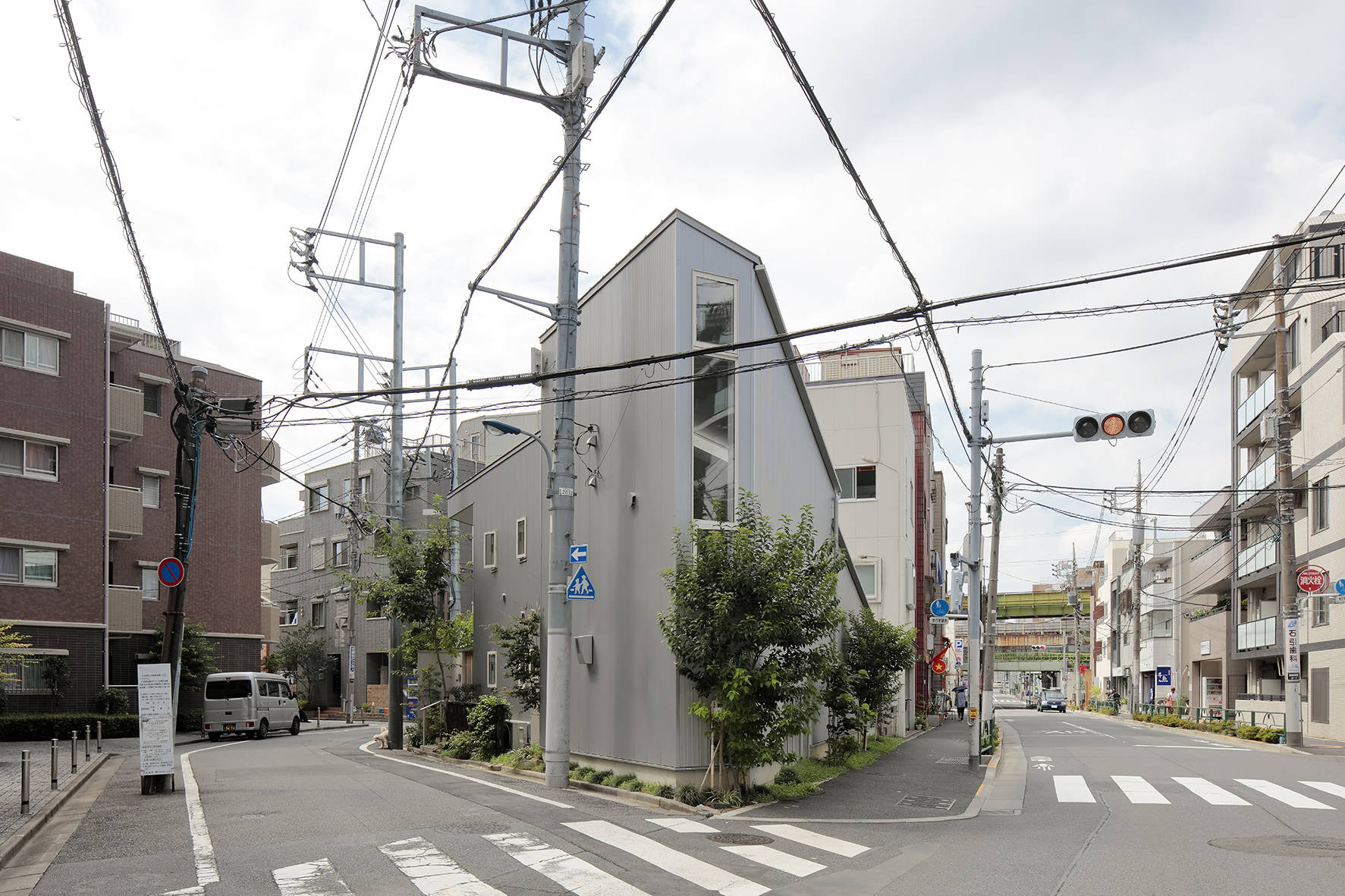 敷地はバスも通る道路に挟まれた三角形の敷地でした。周辺は低層の住宅や工場が立ち並んでいましたが建て替えによって大きな倉庫・高層集合住宅・オフィスが立ち並ぶ環境になったそうです。道路からも集合住宅のバルコニーからも道路の反対側のオフィスからも覗かれる環境において如何に閉じつつ光を取り込むか?が設計のポイントとなりました。