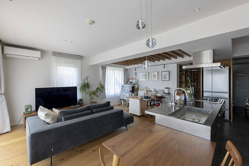 賃貸住宅でお住まいだったご夫婦がコロナ禍を経て、「家に自分たちを合わせるのではなく、自分たちに合わせて家をつくる」をテーマにリノベーションした住宅です。お施主さんから提示されたリノベーションのコンセプトは「料理、絵画、音楽、仕事の企画などひらめきをすぐ形に出来る場。疲れたらすぐに休めて、ひらめいたらすぐにスケッチ出来る場。仕事場やアトリエ、スタジオの手前ぐらいの作業と、のんびりできる空間をストレスなく、行ったり来たり出来る空間」でした。