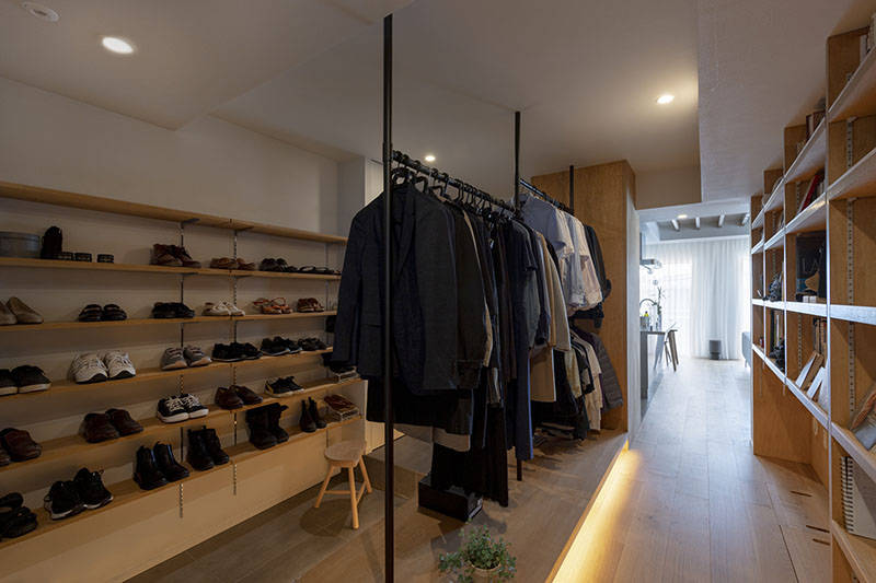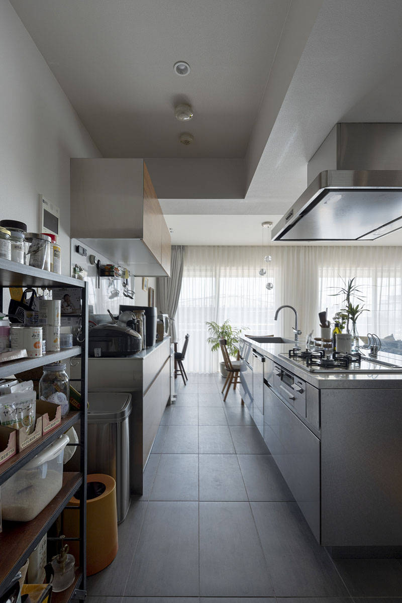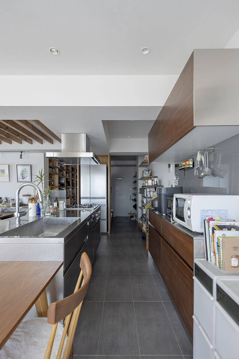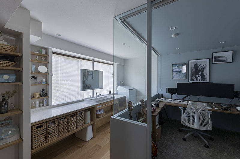 南北に細長く南側と西側に窓のある住戸でした。一方で南北のちょうど真ん中には構造壁で撤去不可なコンクリートの壁があり、間取りに大きな制約を生み出していました。行ったり来たり出来るシームレスな空間を作るためには距離が必要と考えて、LDKから廊下を経て仕事場、洗面室、浴室、寝室へと至る住戸としました。この廊下に大容量の収納とクローゼットを設置し「人と物の接点」を多く作りました。この廊下を行ったり来たりする中で、仕事のアイデアが浮かんだり、今日のお昼が浮かんだり、リラックスから少し仕事モードになったりが生み出されればと思っています。